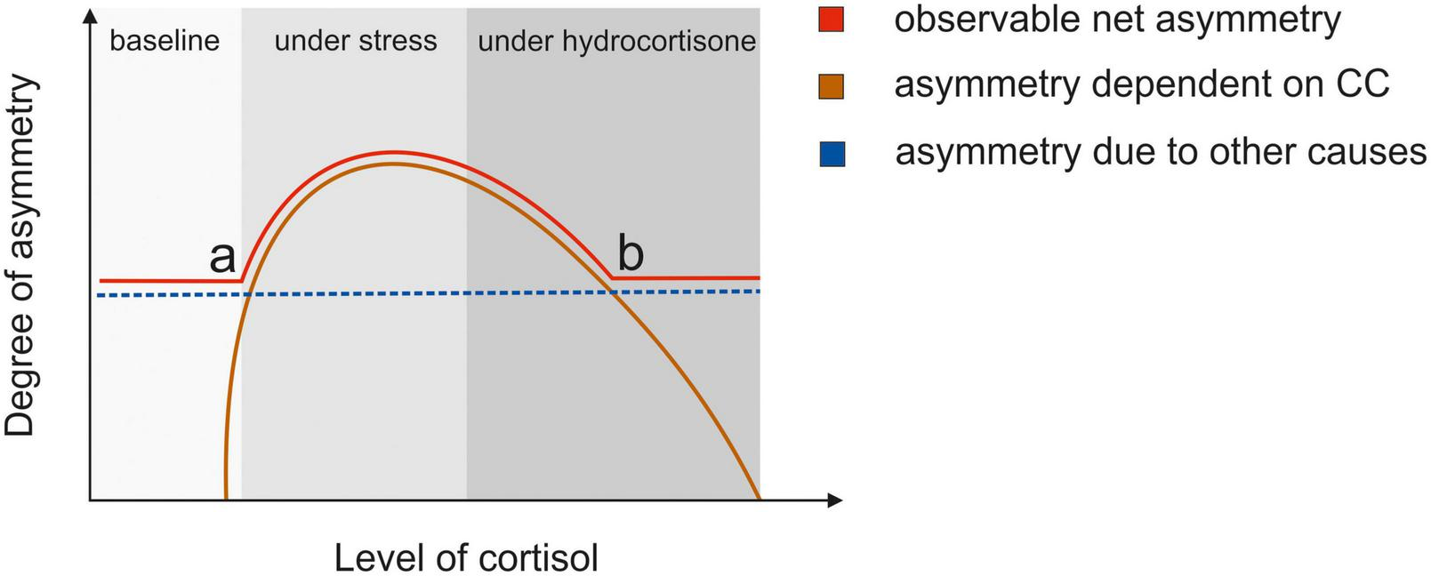 The hypothesized relationship between the degree of interhemispheric integration and level of cortisol. This model assumes that interhemispheric integration of information and functional hemispheric asymmetries can be seen as two sides of the same coin akin to assumptions made by Bayer et al. (21). The blue line indicates the level of asymmetry that is dependent on other factors than the corpus callosum, e.g., hemispheric specialization. This degree of asymmetry is constant and independent of levels of circulating hormones. The orange line indicates the degree of interhemispheric integration that depends on the corpus callosum, which can be influenced by changing hormone levels. If the cortisol level rises due to stress, the membrane MR receptors are partially occupied leading to a higher degree of integration. This leads to the apex in the curve. If cortisol levels are higher due to pharmacological administration of hydrocortisone, GR receptors are saturated. The red line indicates the observable degree of interhemispheric integration. At (a) the Integration rises due to rising cortisol levels improving callosal function. At (b) while the integration of information through the corpus callosum decreases due to high cortisol levels, the net integration levels out at the baseline degree of asymmetry that stays stable.