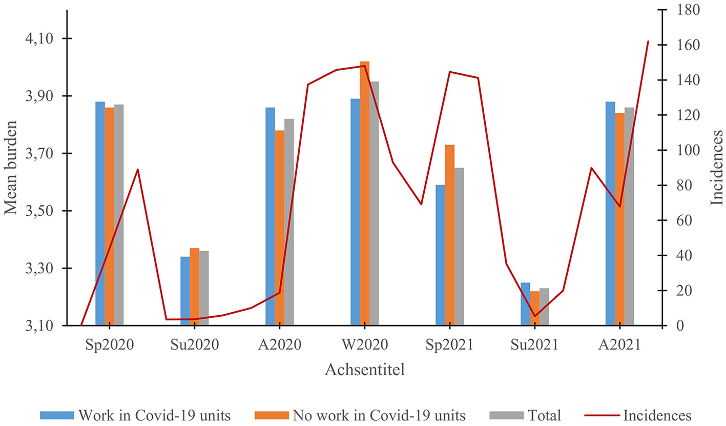 Subjective burden over time. Presentation of mean burden scores at the different measurement time points for the total sample and the “work in COVID-19 units” and “no work in COVID-19 units” subsamples in relation to the nationwide COVID-19 7-day incidence rate over time at the beginning of each month (for exact scores see Figure 1).
