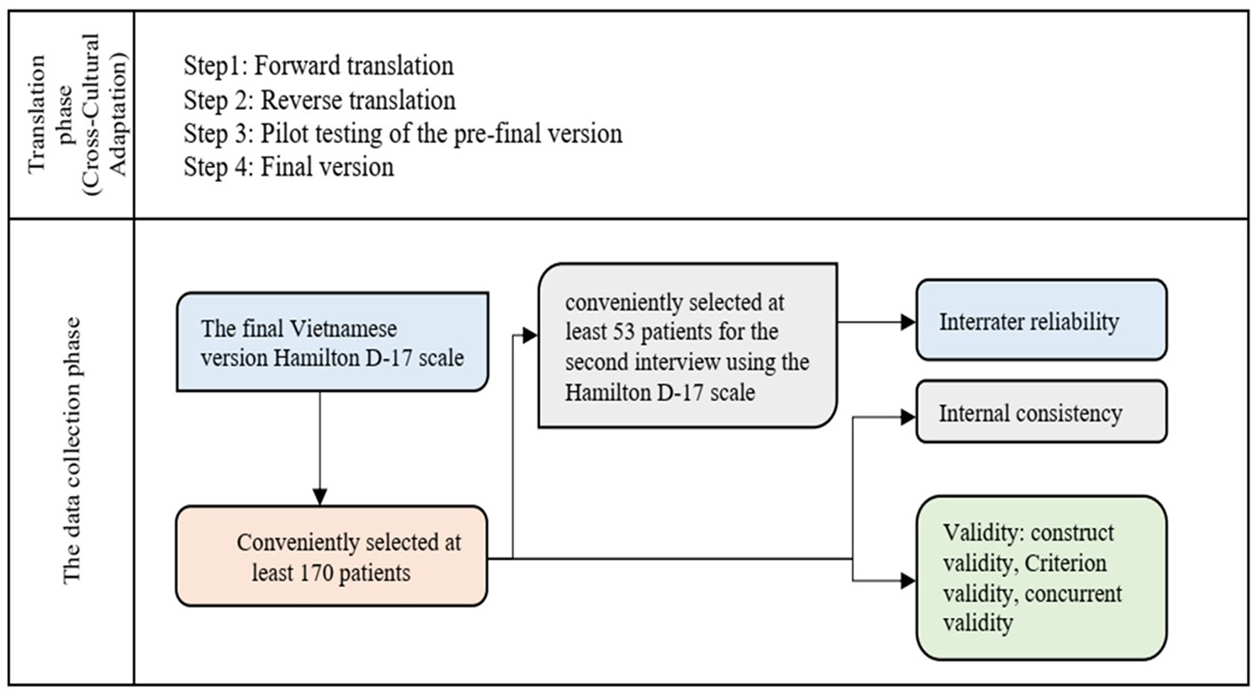 The Hamilton D-17 scale was translated into Vietnamese using a standard forward-backward translation approach (Figure 1). In the forward translation step, the original English version of Hamilton D-17 was translated into Vietnamese by two Vietnamese experts who were also fluent in English. These included an experienced psychiatrist and an expert in scientific research who had studied in Australia for more than 5 years. These two translators worked independently and then their translations were compared. Any differences between the two translations were discussed with the principal investigator. After reaching a consensus, a Vietnamese version of the Hamilton D-17 was finalized. Next, this Vietnamese version was translated back into English by a language specialist who was fluent in both English and Vietnamese, in which English is the mother language. In the last step, the back-translated version was compared with the original version of the Hamilton D-17 by an English native speaker who worked as an English teacher at the Western Australian International School. Since no major difference was found, the Vietnamese version of the Hamilton D-17 was used in the main study. However, to ensure the feasibility of the scale in clinical practice, the scale was sent to 8 psychiatric residents for testing on 15 patients. A discussion was organized between the researchers and the psychiatric residents to revise some minor wording of the scale.