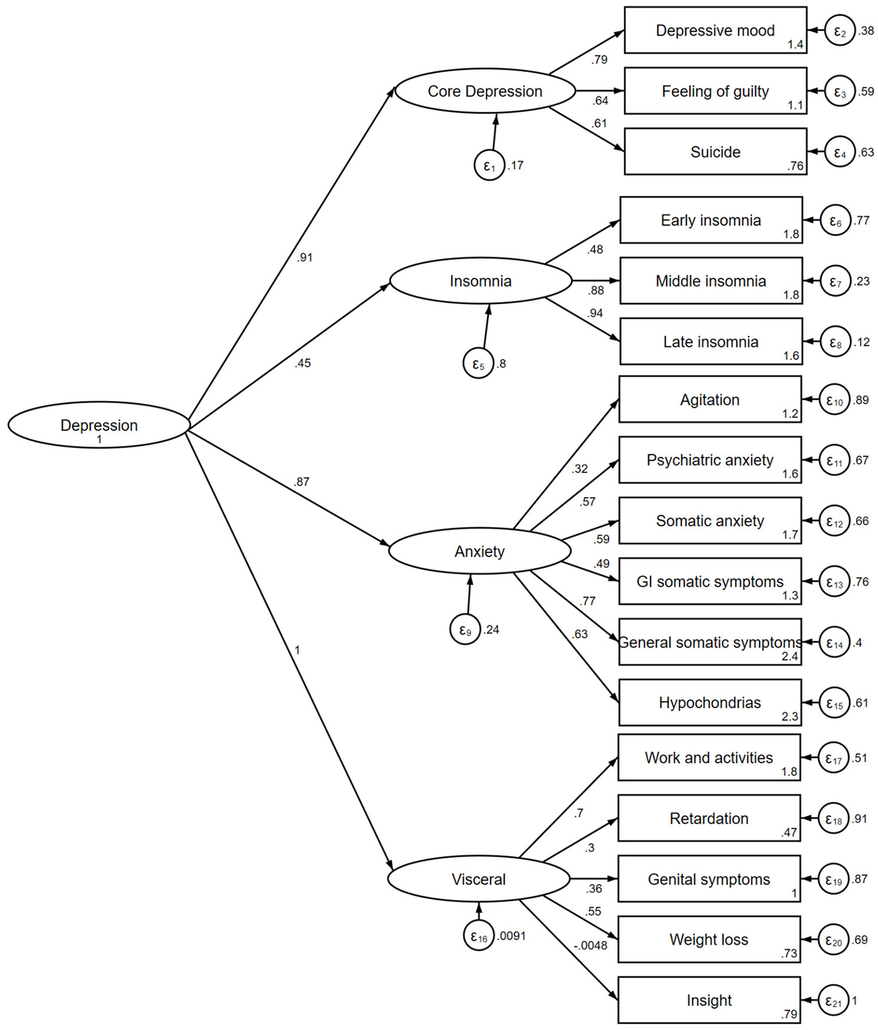 Both Cronbach alpha coefficient and ICC were at good level at alpha = 0.83 and ICC = 0.83. CFA with a second-order model consisting of four factors fitted the data at good to excellent level. The SRMR (Standardized Root Mean Squared Residual) was 0.066, RMSEA (Root Mean Square Error of Approximation) (90% CI) was 0.053 (0.036–0.069), CFI (comparative fit index) was 0.93, TLI (Tucker Lewis index) was 0.92. The Hamilton D-17 and the PHQ-9 had a correlation coefficient of r = 0.77 (p < 0.001). The Hamilton D-17 had a very high level of criterion validity with AUC of 0.93 (0.88–0.98).