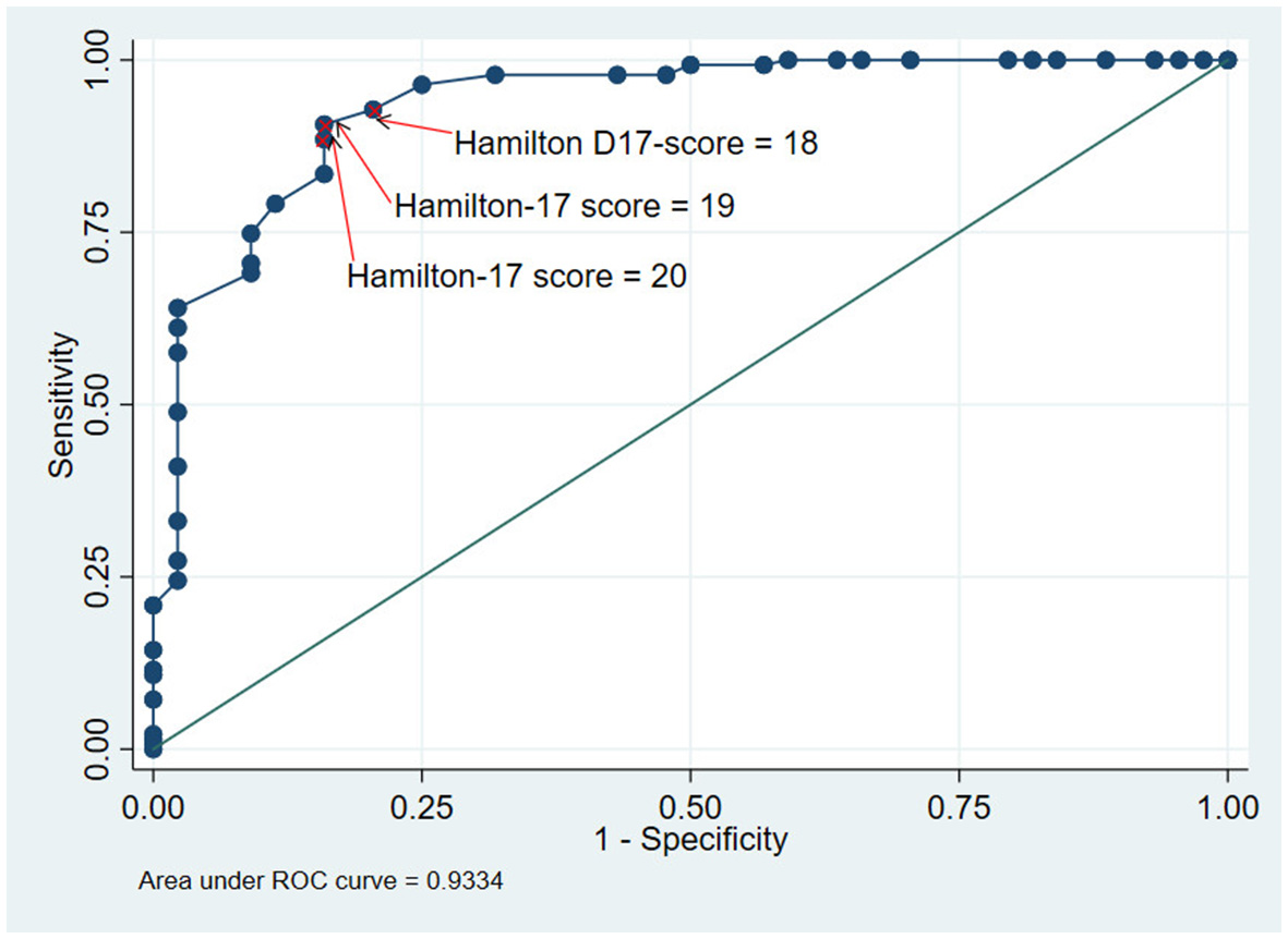 Although the Hamilton D-17 was not used as a diagnostic tool, the area under the ROC curve indicated that the Hamilton D-17 scale had a very high level of accuracy. This means that the Hamilton D-17 can be used to identifypatients with major depressive disorders as accurate as using theDSM-5. Our result is similar to a study by Romera on 292 patients from 36 psychiatric centers in Spain (AUC = 0.82; 95% CI = 0.76–0.87) (19) or Ballesteros' study on 113 patients (AUC = 0.93; 95% CI = 0.86–0.99) (20). In addition, our study also suggests a cut-off to distinguish patients with and without a major depressive disorder. In our study, a value of the Hamilton D-17 of 19 or greater turns out to be the optimal cutoff with high level of sensitivity and specificity. However, when the sensitivity is prioritized or the specificity is needed, the cut-off of 18 and 20 can also be used.