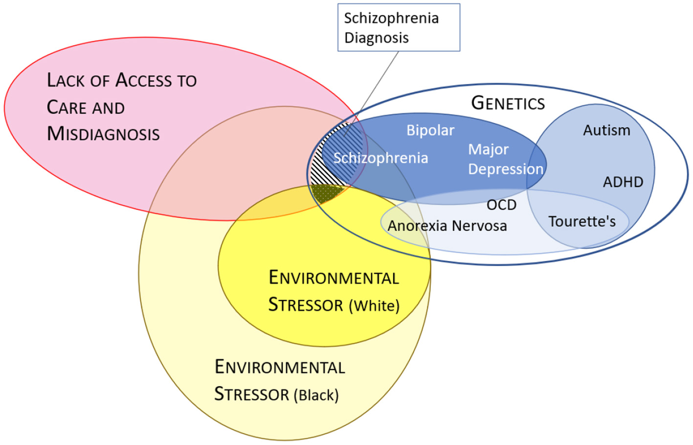 Potential factors leading to higher observed diagnoses of schizophrenia. Model of how factors leading to a diagnosis of schizophrenia can differ between Black and White individuals taking into account differences in environment, access to care, misdiagnoses and genetics (15). Stripped area represents diagnoses of schizophrenia in Black populations which has been observed to be greater than in White populations (dotted area). The blue ovals (genetics) are based on a risk model from the Cross-Disorder Group of the Psychiatric Genomics Consortium (3). Misdiagnosis and lack of care (red oval) appears to affect racialized individuals (i.e., Black) more often than White individuals (intersecting orange areas).