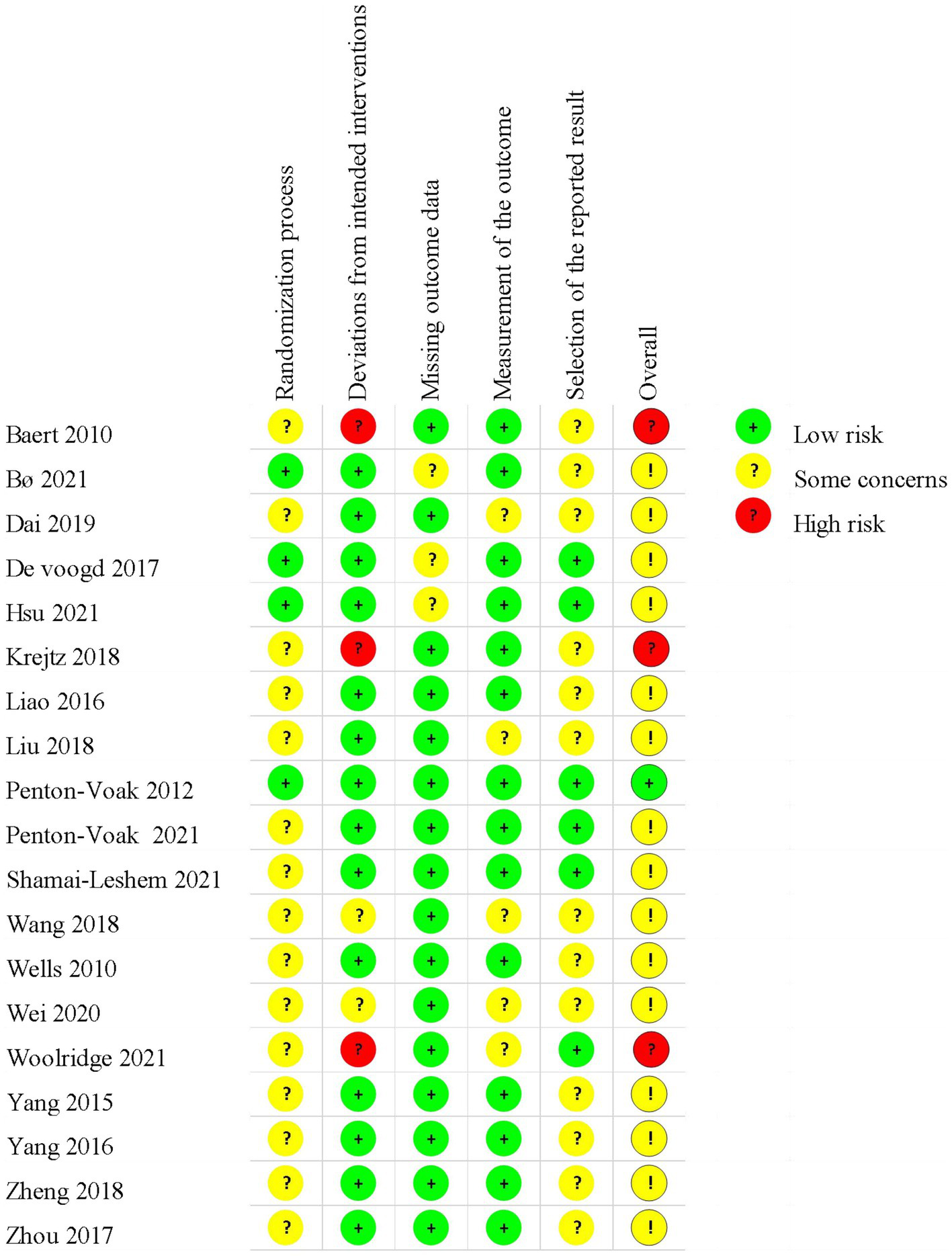 Considering the deviation from intended interventions, 14 trials (17, 18, 38–43, 45–47, 50–52) performed appropriate analysis on all randomly assigned participants, which were judged as low risk of bias. Two studies (48, 49) did not report blinding, which was considered as some concerns. The remaining three trials (26, 37, 44) were regarded as high risk due to no blinding in outcome assessors and inappropriate analysis.