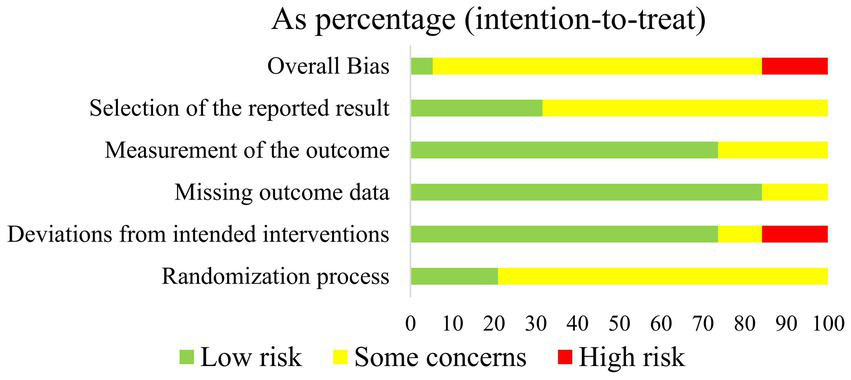 The plot of the risk of bias (RoB 2.0) for each included study is presented in Figure 2, and the proportions of individual studies are presented in Figure 3.