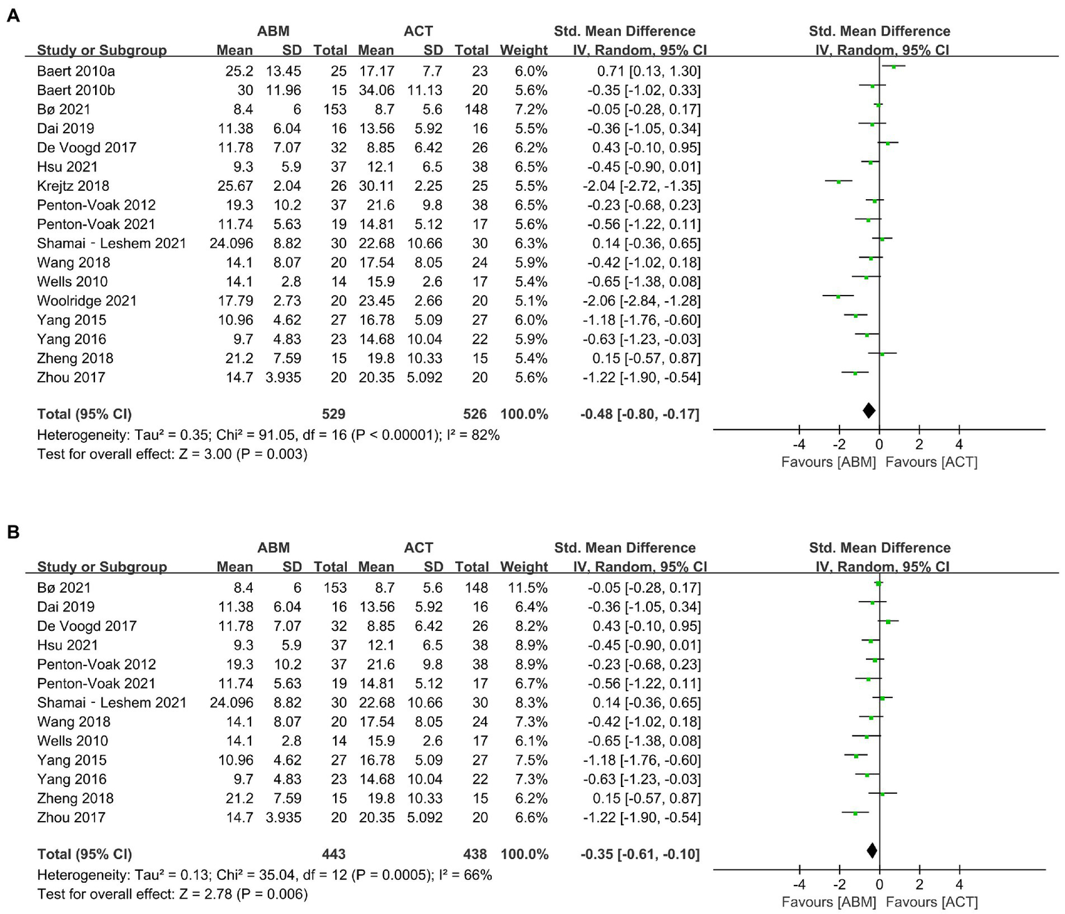 A total of 19 trials involving 20 datasets (1,262 participants) were included. The overall risk of bias in one study was rated as low risk of bias, three studies were considered as high, and the remaining studies were some concerns. Compared with attention control training (ACT), ABM had a greater effect in the improvement of depression (SMD = −0.48, 95% CI −0.80 to −0.17, I2 = 82%) and rumination (MD = −3.46, 95% CI −6.06 to −0.87, I2 = 0%). No significant differences were observed in the attentional control outcome between ABM and ACT (MD = 3.07, 95% CI −0.52 to 6.65, I2 = 0%). Subgroup analysis demonstrated that adults exhibited a greater decrease in depression scores than adolescents. ABM using the dot-probe task, training target stimulus presented by face, and training directions by left–right were associated with better antidepressant effects. ABM training delivered in the laboratory tended to yield a better effect than those conducted at home. Sensitivity analysis indicated that the results were robust. The certainty of the evidence for all outcomes was low or very low, and publication bias may exist.