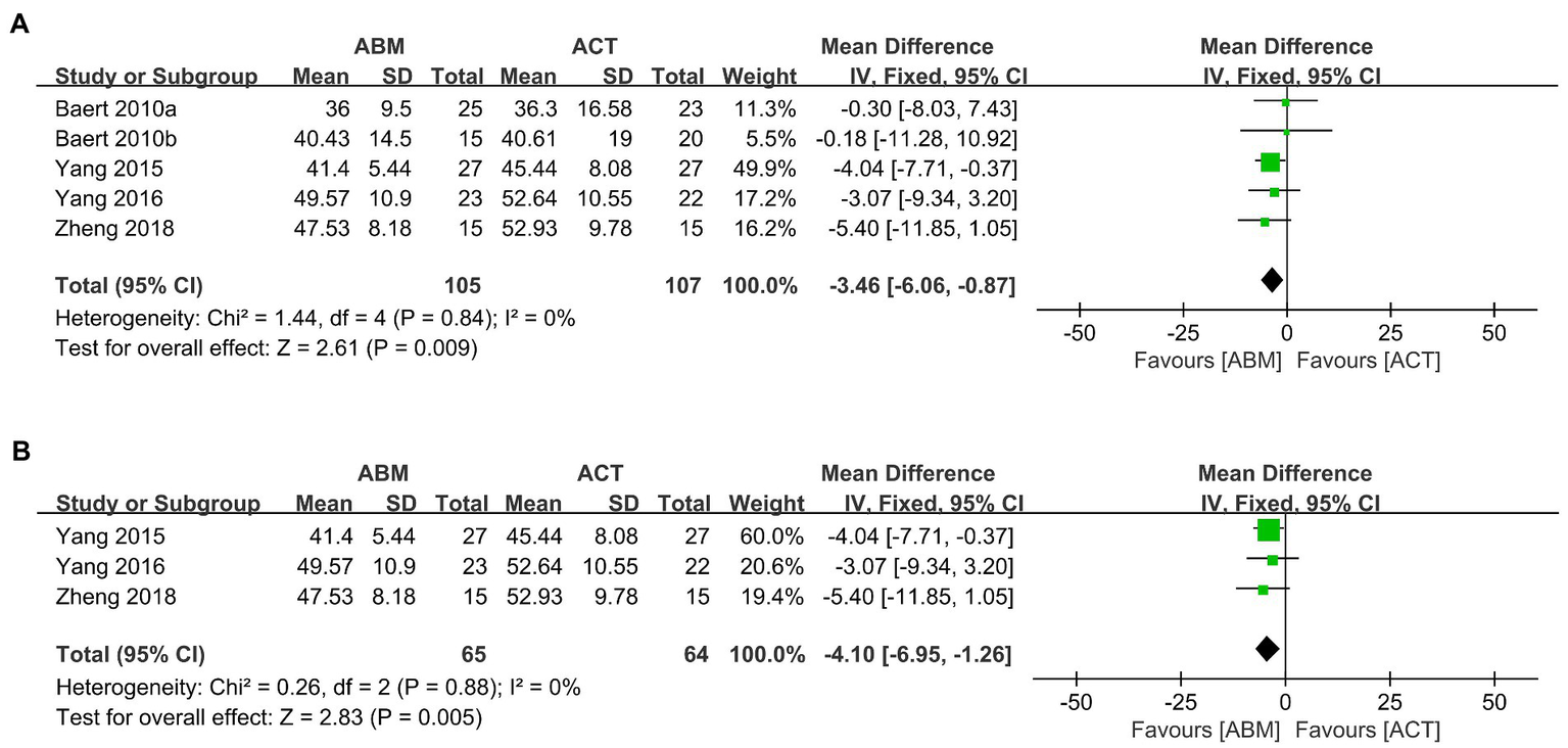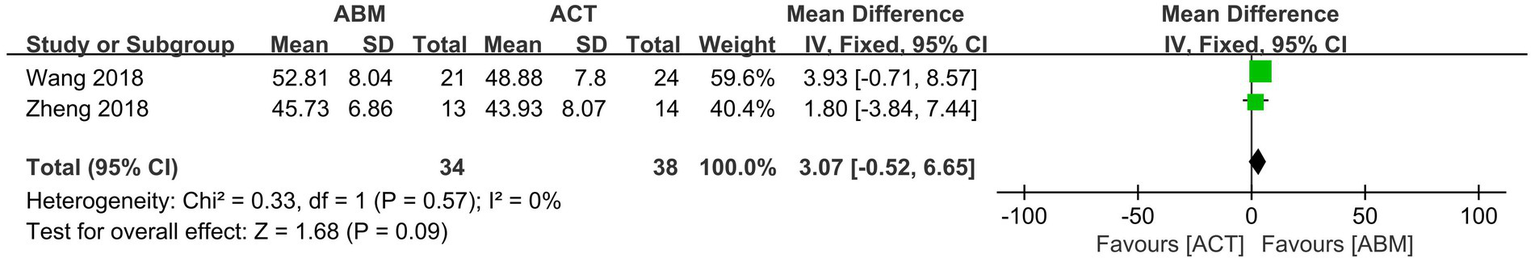 No difference was identified between ABM plus CT and ACT plus CT in alleviating depressive symptoms (SMD = −0.11, 95% CI −0.43 to 0.21), I2 = 0%) (43, 49).