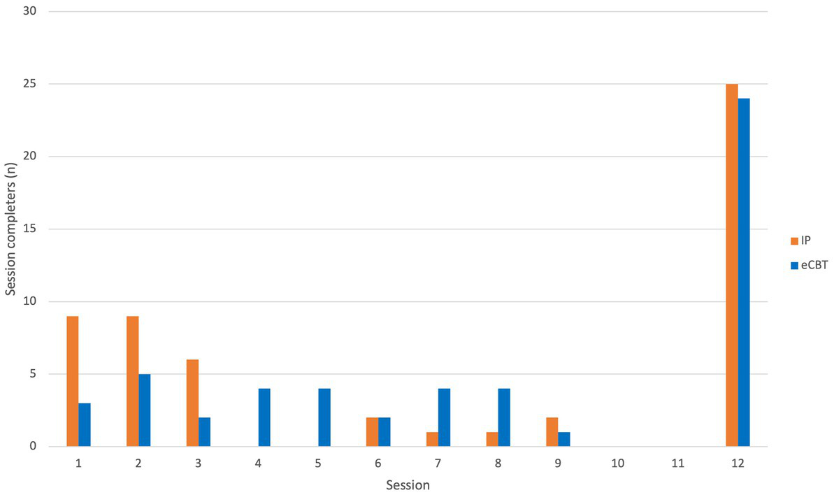 Frequency of participants’ last completed sessions organized by CBT delivery type.