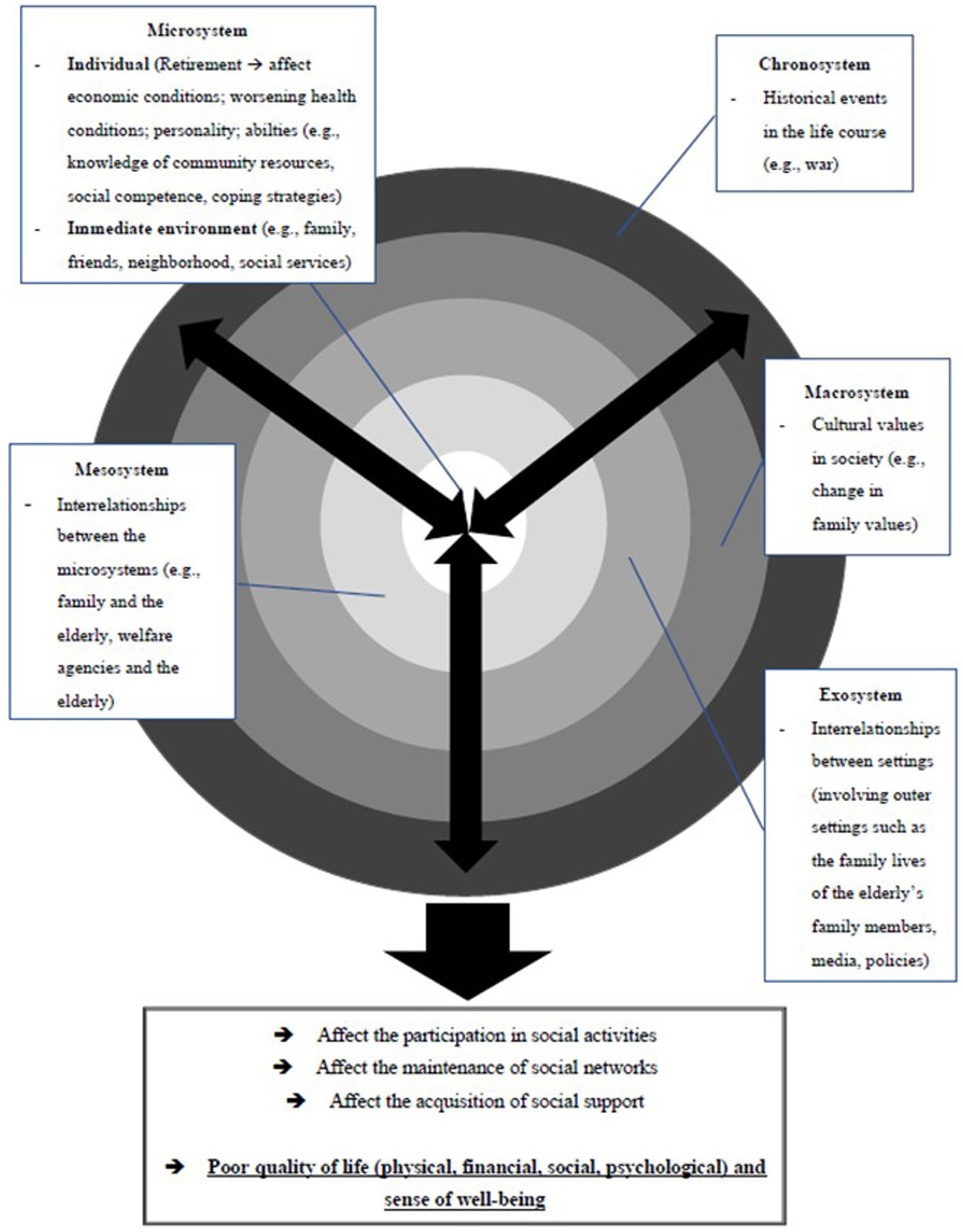 The above literature illustrates the life situations of the elderly in social isolation, as well as the underlying factors which are intrapersonal, interpersonal, and societal. This results in an overall poor quality of life in terms of physical, financial, social, and psychological well-being. It is noted that these factors are mutually influential; for example, apart from the shrinking social circles, the adverse physical and financial situations of the elderly discourage their participation in social activities, which further limits their ability to build and maintain social networks and, in turn, affects the amount of social support they receive. While it is widely stated that living alone and social isolation of the elderly contribute to their negative well-being, loneliness, and a lowered quality of life (69–72), the perceived quality of social relationships and social support received appears to play a part in affecting these elderly’s sense of well-being, and it might be influenced by socio-cultural factors. In non-Chinese cultural contexts, living alone does not necessarily bring about a sense of loneliness (73). In contrast, in Chinese contexts where family and social cohesiveness are valued, the elderly who live alone are more likely to experience loneliness (10, 11, 74). This suggests that the elderly in social isolation in Chinese contexts, such as in Hong Kong, are likely to experience a lower sense of well-being and a lower quality of life. The intertwining influence of the multi-level factors suggests the plausibility of using the social systems perspective (75–78) to investigate elders in social isolation.