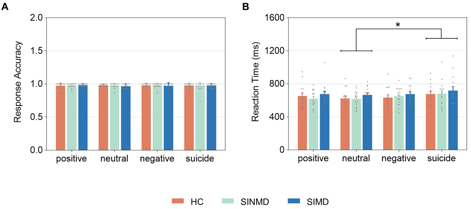 Behavioral performance on the emotional Stroop task. (A) Response accuracy. (B) Reaction time. Error bars represent standard deviation of the mean. The gray, solid points reflect individual participant data. Asterisk (*) depicts significant differences (p < 0.05). SIMD, individuals with suicidal ideation as well as mental disorders; SINMD, individuals with suicidal ideation but no mental disorders; HC, healthy controls.