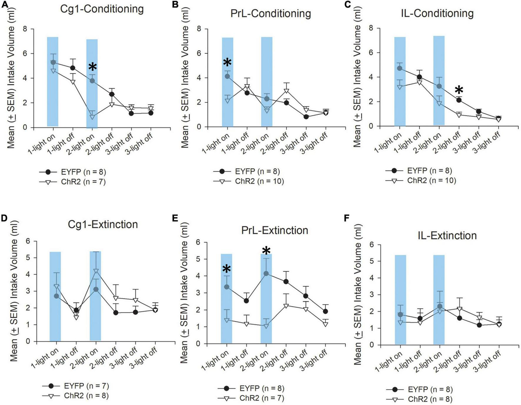 In some cases, to identify whether the intake volume of saccharin solution was significantly different between light-off or light-on treatments, a one-way ANOVA was performed to evaluate the mean (±SEM) intake volume of saccharin solution for light-off and light-on sessions between the EYFP and ChR2 groups. Additionally, the mean (±SEM) intake volume of saccharin solution was analyzed by one-way ANOVA in light-on 1, light-off 1, light-on 2, light-off 2, and twice light-off 3 between the EYFP and ChR2 groups in the Cg1, PrL, and IL during conditioning and extinction phases. p < 0.05 was considered statistically significant.