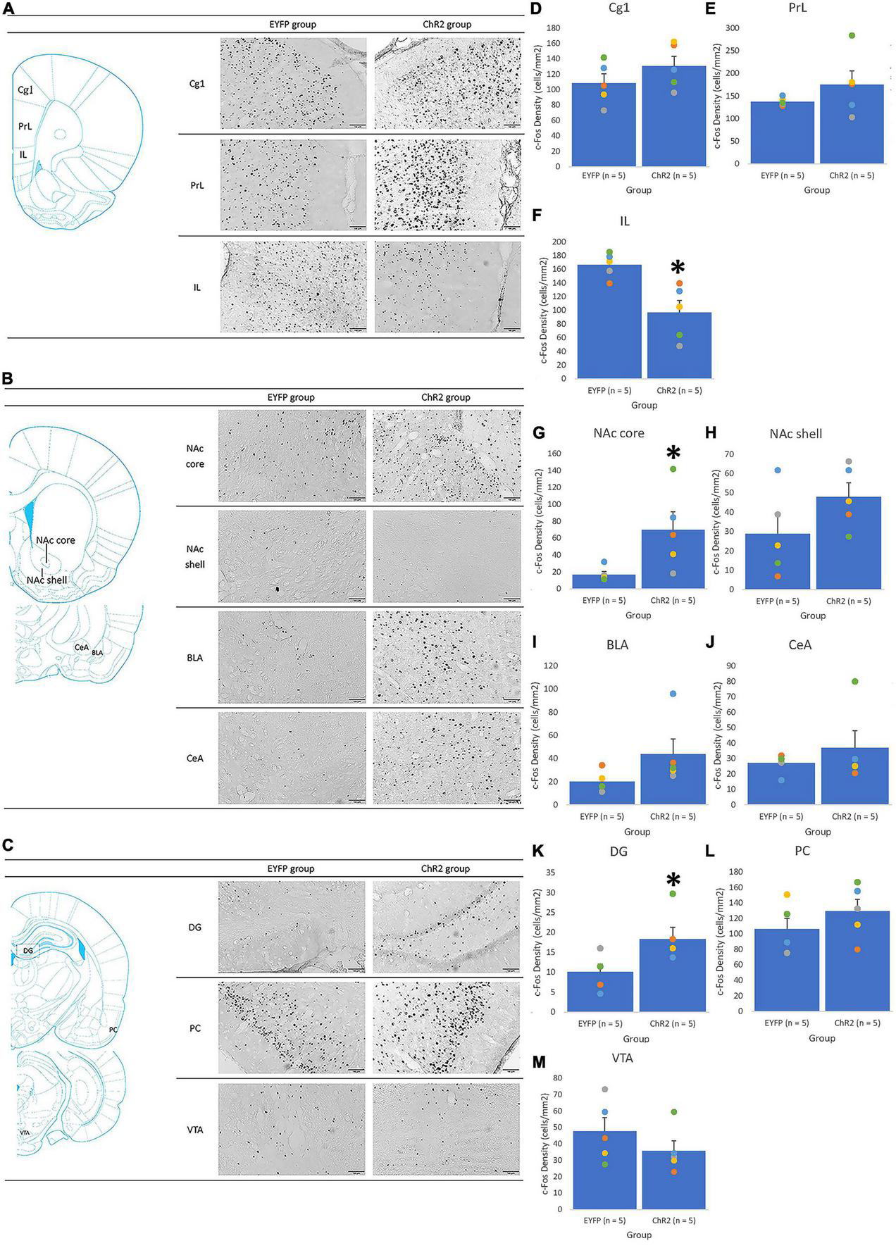 If the behavior testing results were significantly different, the c-Fos expression data were analyzed by one-way ANOVA for the Cg1, PrL, IL, NAc core, NAc shell, BLA, CeA, DG, PC, and VTA.