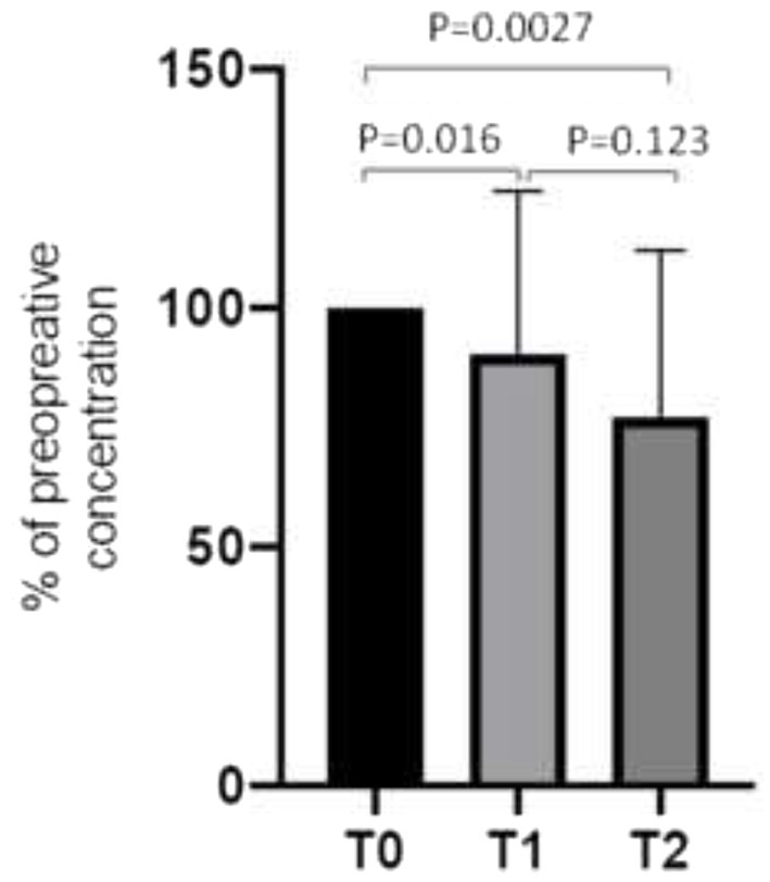 The plasma concentrations of SSRI/SNRI dropped significantly in the bariatric surgery group from T0 to T2 by 24.7% (95% confidence interval [CI], −36.8 to −16.6, p = 0.0027): from T0 to T1 by 10.5% (95% 17 CI, −22.7 to −2.3; p = 0.016), and from T1 to T2 by 12.8% (95% CI, −29.3 to 3.5, p = 0.123), respectively.