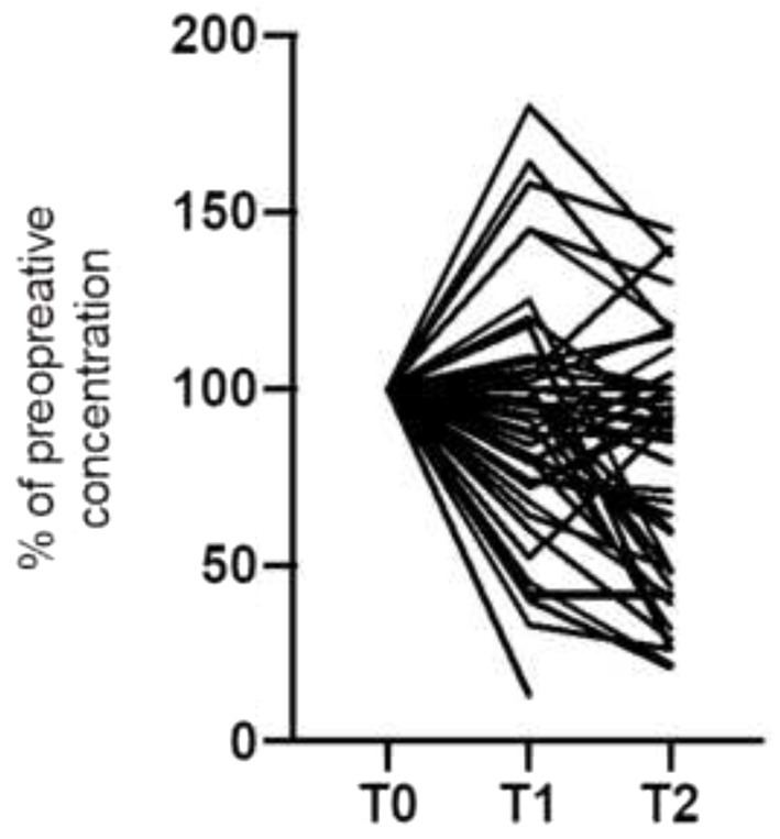 Individual course of the plasma concentration of antidepressants SSRI/SNRI in patients undergoing bariatric surgery (n = 46): before (T0), 1 month (T1), and 6 months (T2) after bariatric surgery.