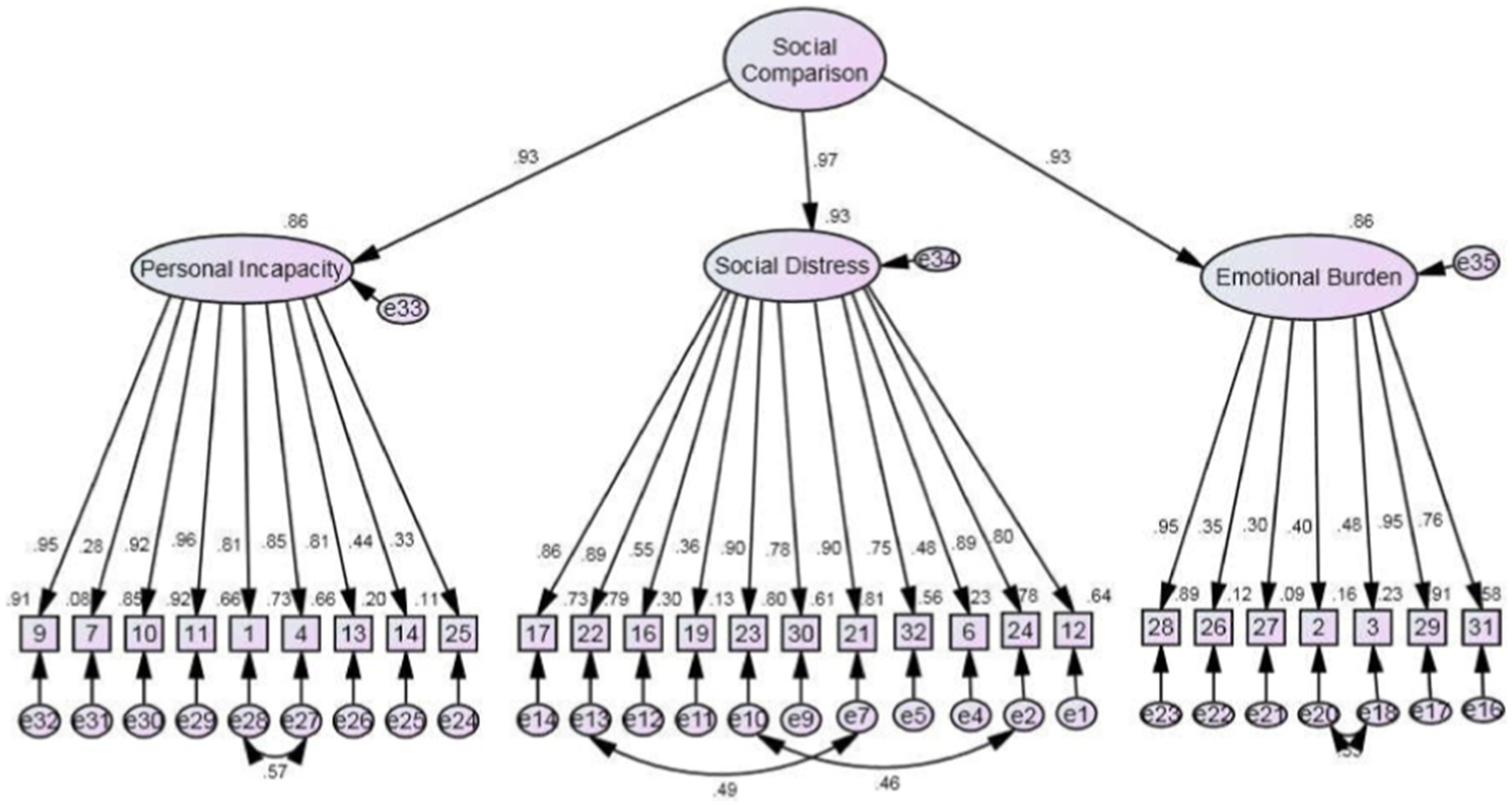 Item-total correlation of SCS-WI was run to see the internal consistency of the scale. Results indicated that each item of Social Comparison Scale for Women with Infertility correlated (r ranging from 0.44 to 0.78) with the sum of total items. Moreover, mean inter-item correlation was 0.50. Thus, all items are considered valid and reliable indicators of Social Comparison scale for Women with Infertility. Cronbach’s alpha for SCS-WI with infertility (α ranging from 0.89 to 0.94), which is good along with the potential range and actual range of the SCS-WI. Furthermore, if we compare the mean of the sample with the potential range of the score on the relevant scale, it appears that on SCS-WI, the mean score is 81.85 and the maximum potential range is 0–128, which indicates that average score of the sample lies on the higher direction showing higher social comparison in women with primary infertility. As far as factor 1, i.e., Social Distress, is concerned, the mean score is 30.10 and the maximum potential range is 0–60, indicating that the score of the sample lies on the average side, whereas a mean score of 21.06 on factor 2, i.e., Emotional Burden, with potential range of 0–36, indicates that the sample mean lies on higher side on this factor. Lastly, the sample mean on factor 3, i.e., Personal Incapacity, is 24.76 with potential range of 0–32, indicating sample mean on higher side in this factor as well. The reliability of this scale (Cronbach’s alpha) was α = 0.92 (Table 2).