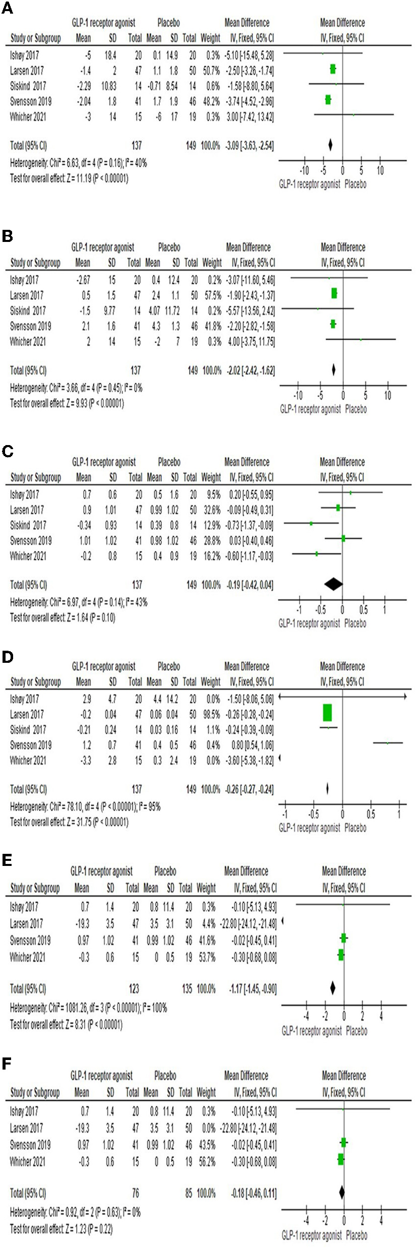 The impact of the GLP-1RA on fasting plasma glucose was examined by five studies (22–26). Results showed that the total effect did not favor either of two groups [MD = −0.19 (-0.42, 0.04), P-value = 0.1]. The findings of the studies were homogenous (P-value = 0.14, I2 = 43%) as shown in Figure 4C.