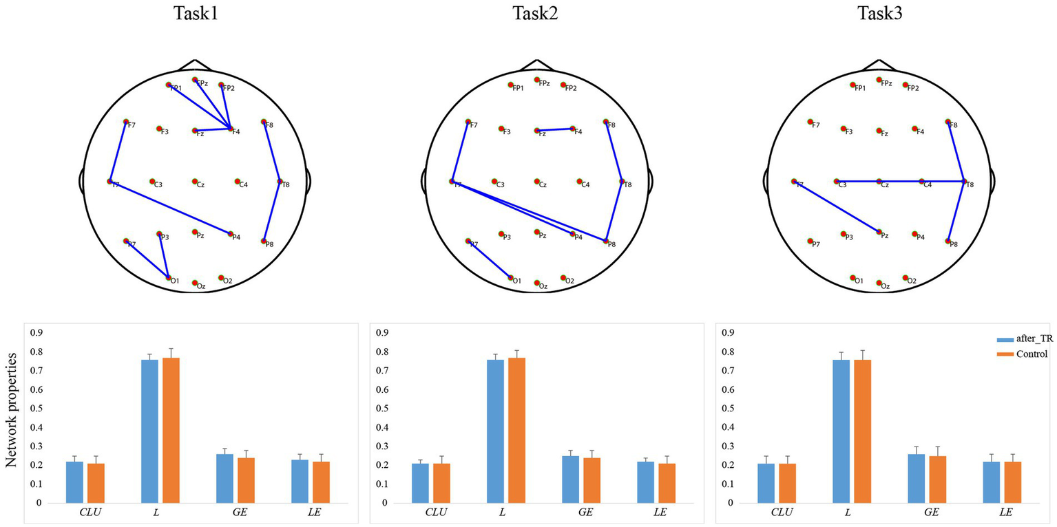 The first line is network topology differences between the after_TR group and the control group in the cool executive tasks (Task 1: THT; Task 2: TMT-A; Task 3: TMT-B). The corresponding network properties in the three tasks were below the network topologies. The blue solid lines denote the stronger network edges (p < 0.05, FDR corrected) of the after_TR group compared to those of the control group.