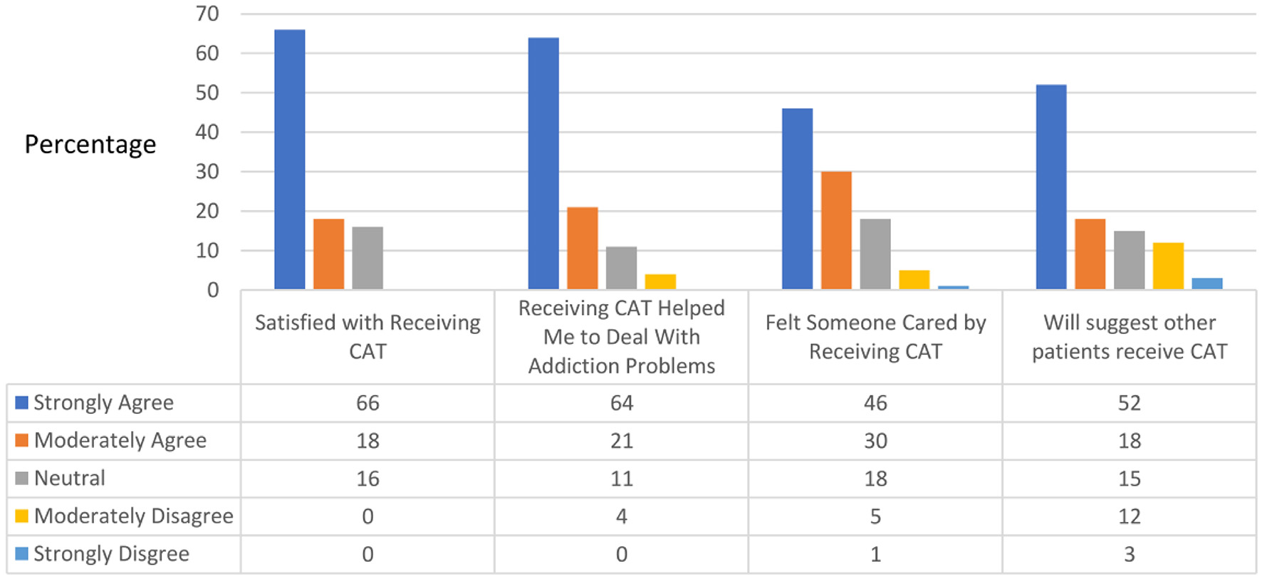 Of the 33 participants who completed the study treatment program, 29 completed the Mobile Phone Use Questionnaire at the end of the 6-month follow-up. The experimental group reported relative satisfaction with the chatbot, as indicated by strong-to-moderate agreement with the following statements: “Satisfied with receiving CAT” (84%), “Receiving CAT helped me to deal with addiction problems” (85%), “Felt someone cared by receiving CAT” (76%), and “Would suggest that other patients receive CAT” (67%) (Figure 4). Only two patients reported technical difficulties in receiving CAT, while the rest reported strong or moderate agreement that the chatbot was easy to use. Upon review by three experts, the mean app quality score evaluated by the MARS was 4.47 (total score range: 1–5), with scores for each section as follows: engagement, 4.00 (1–5); functionality, 4.50 (1–5); esthetics, 4.44 (1–5); and information, 4.95 (1–5).