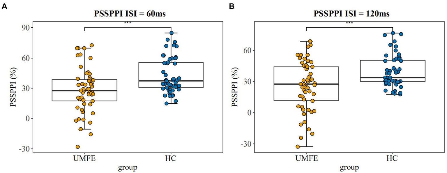 There were no significant differences between the two groups in terms of the amplitude of startle stimulation and the latency of maximum amplitude. The UMFE group had lower scores than the healthy control group in the PPI index of perceptual spatial separation (PSSPPI) at both time intervals, while there was no significant difference in perceptual space colocation (PSCPPI) between the two groups at both the 60 ms and 120 ms intervals. The effect size of PSSPPI were 0.73 (Cohen’s d = 0.73, 95% CI [0.34–1.12]) at 60 ms and 0.70 (Cohen’s d = 0.70, 95% CI [0.31–1.09]) at 120 ms, with a statistically significant difference between the two groups (p < 0.01 for both). These results suggest that the UMFE group had impaired sensorimotor gating compared to the healthy control group. Table 2 and Figure 2 provide more details on these findings.