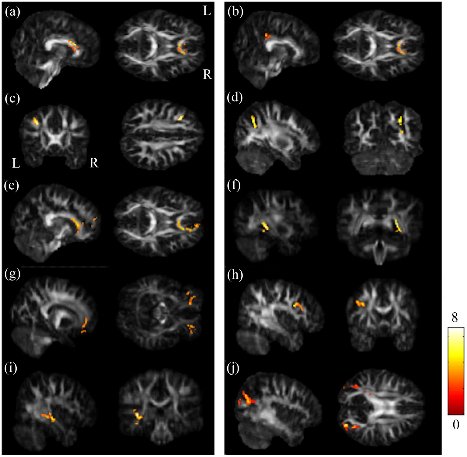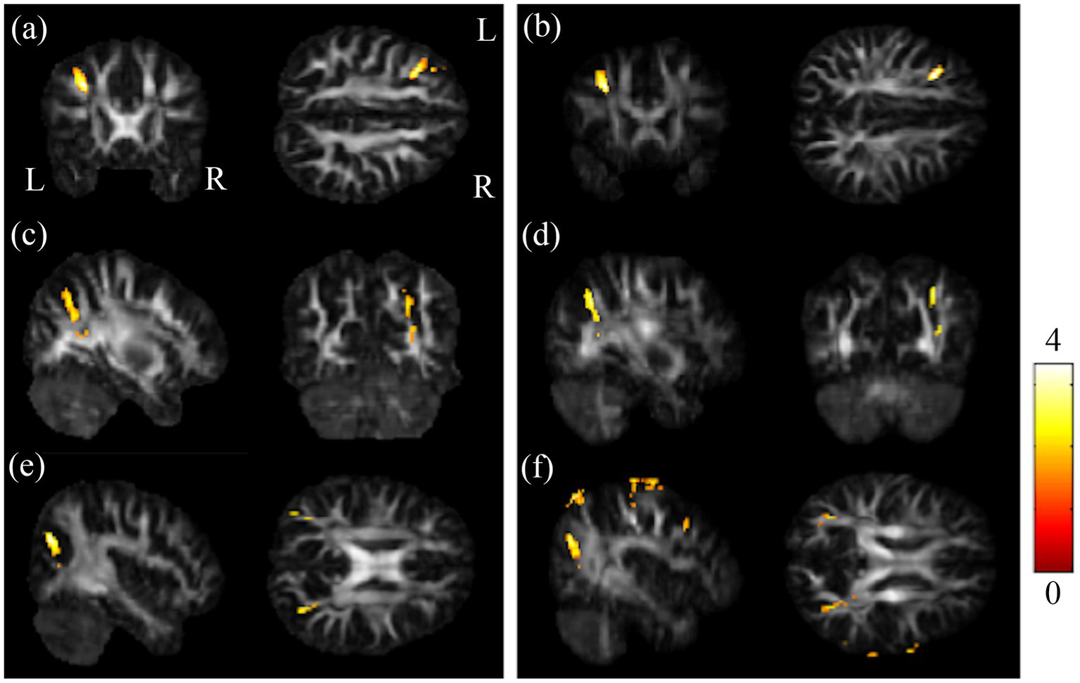 Figure 2. Results of post-hoc t-test between BB and HC groups. Regions showing remarkably reduced GFA/NQA values in pre-chemotherapy patients in (A,B) l-MFG, (C,D) r-SPG, and (E,F) bi-MOG. The left column was the results of GFA. And the right column was the results of NQA (α = 0.05). The color bar represents t-scores of t-statistics. Please look for the abbreviation details in the Appendix.