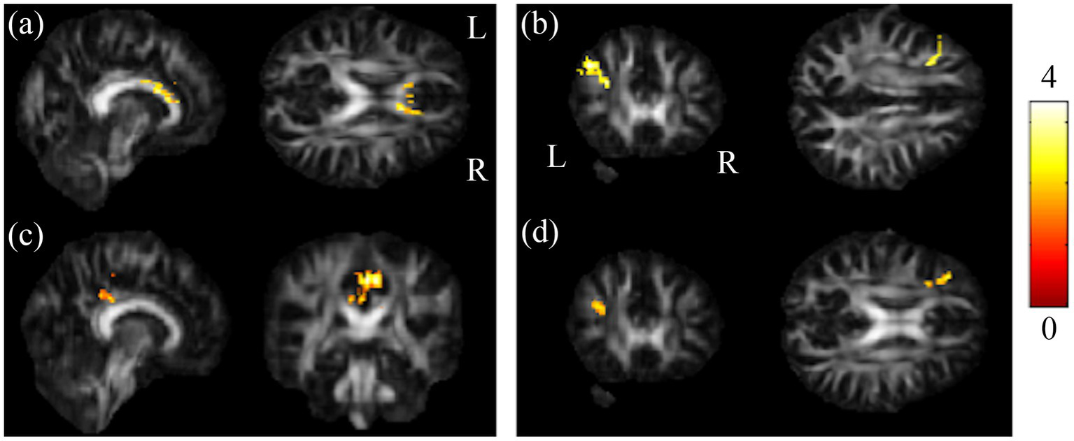 Figure 3. Results of post-hoc t-test showed HC and BB groups larger than BA group. Results of this study demonstrated that the chemotherapy-treated group had significant lower GFA values in (A) CC as well as (B) l-MFG compared to HC, and reduced GFA values in (C) l-PCG as well as (D) l-MFG compared to BB (α = 0.05). The color bar represents t-scores of t-statistics. Please look for the abbreviation details in the Appendix.