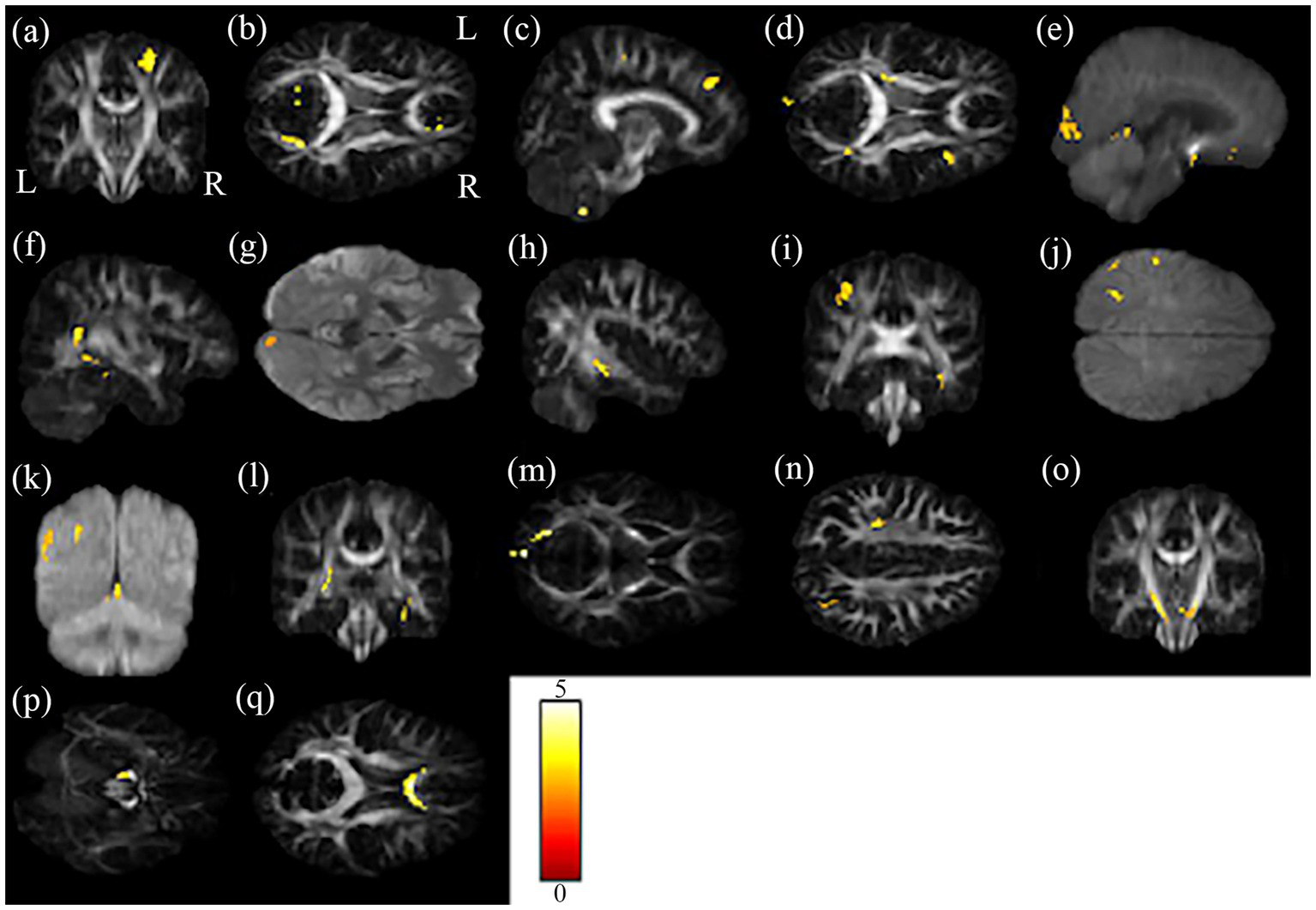 The literature has indicated that the MFG is associated with literacy and numeracy skills, demanding the cognitive domain of attention. Moreover, the MFG served as the gateway between the DAN and VAN (37, 38). Koenigs et al. identified that the superior parietal is crucial to the manipulation of information in working memory, and damage to this region is associated with deficits on tests involving working memory (39). Additionally, Szczepanski et al. observed several pathways that control spatial attention in the DAN. Different from the pathway between the frontal eye field and intraparietal sulcus, which is viewer-centered, the pathway between the supplementary eye field and superior parietal support viewer- and object-centered representations of attentional properties. The supplementary eye field and superior parietal region (SPG) play an important role in task switching that can flexibly regulate condition-action associations (40). Apart from the frontal and parietal lobes, the occipital lobe was shown to be a component of the DAN, which is related to focusing attention on moving objects. These areas of the DAN are connected by the superior longitudinal fasciculus (SLF) (41, 42). Our results showed disruption of local white matter integrity in the frontal, parietal, and occipital parts of the SLF, consistent with previous findings (12).