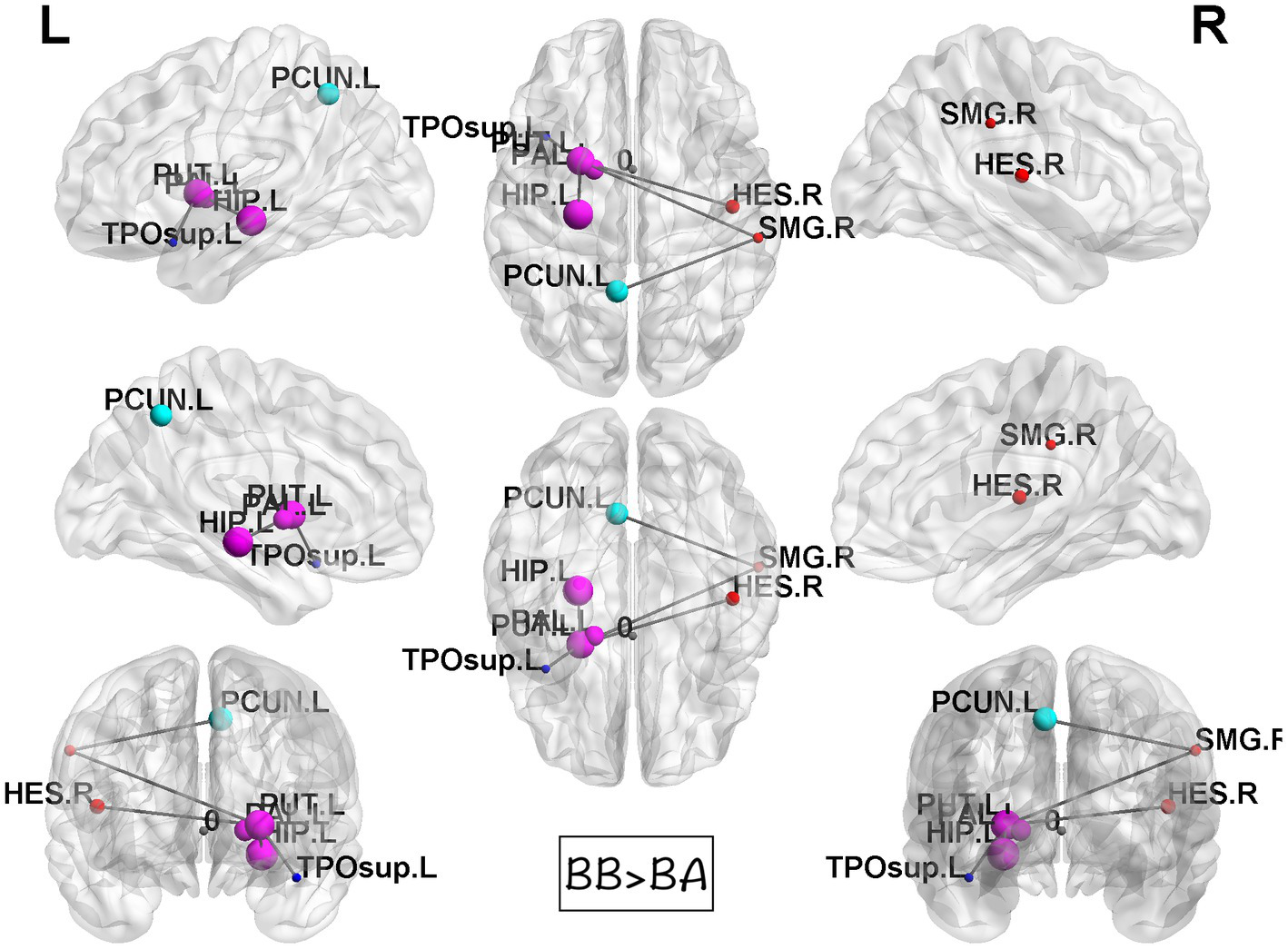 While computing the topological properties, we integrated the AUC of each parameter by extracting the density range from 0.06 to 0.22. Because fragmentation occurs at network density below 0.05, and the measurements reached a plateau at network density above 0.22. Even though there was no statistical significance could be identified in all the tests. It is worth noting that the architecture still fits the definition of small-world network in these three groups. Among the network-based comparisons, connections in BB were statistically significant higher than BA between the regions of putamen, hippocampus, precuneus, and temporal. The result visualized by using BrainNet Viewer was shown in Figure 5.