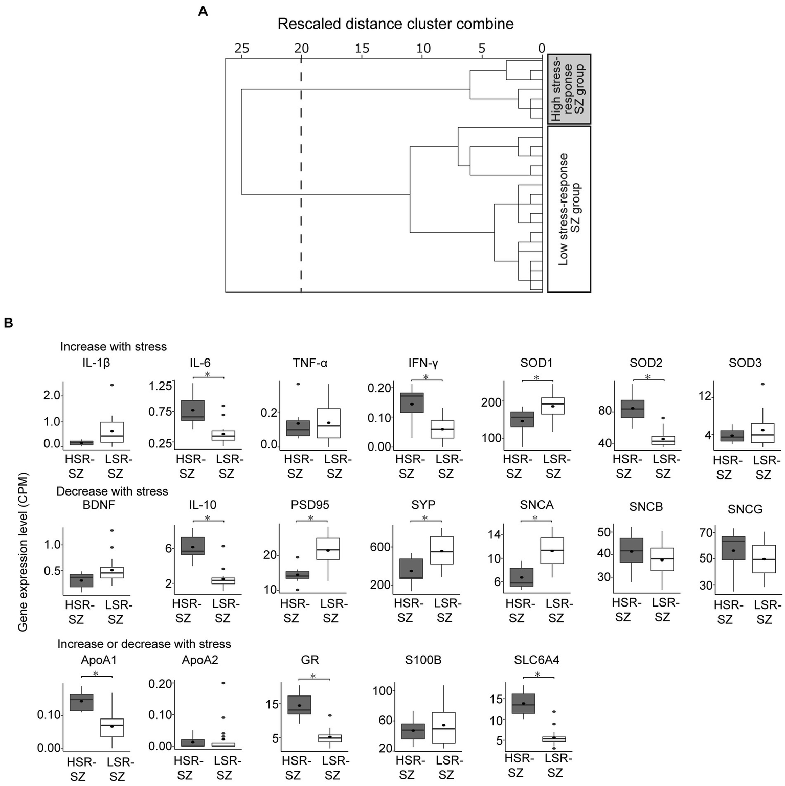 (A) Hierarchical clustering of patients with schizophrenia (SZ) by mRNA levels of stress-responsive molecules. Cluster analysis divided 25 patients with SZ into two clusters at the 20 rescaled distance cluster combine (dashed line). (B) Box-and-whisker plot of gene expression levels of stress-responsive molecules of two SZ subgroups showing the median (thick line in box), 25th and 75th percentiles (box ends), and minimum and maximum (whiskers) values. HSR-SZ, high stress-response SZ group; LSR-SZ, low stress-response SZ group; CPM, count per million; * indicates p < 0.05.