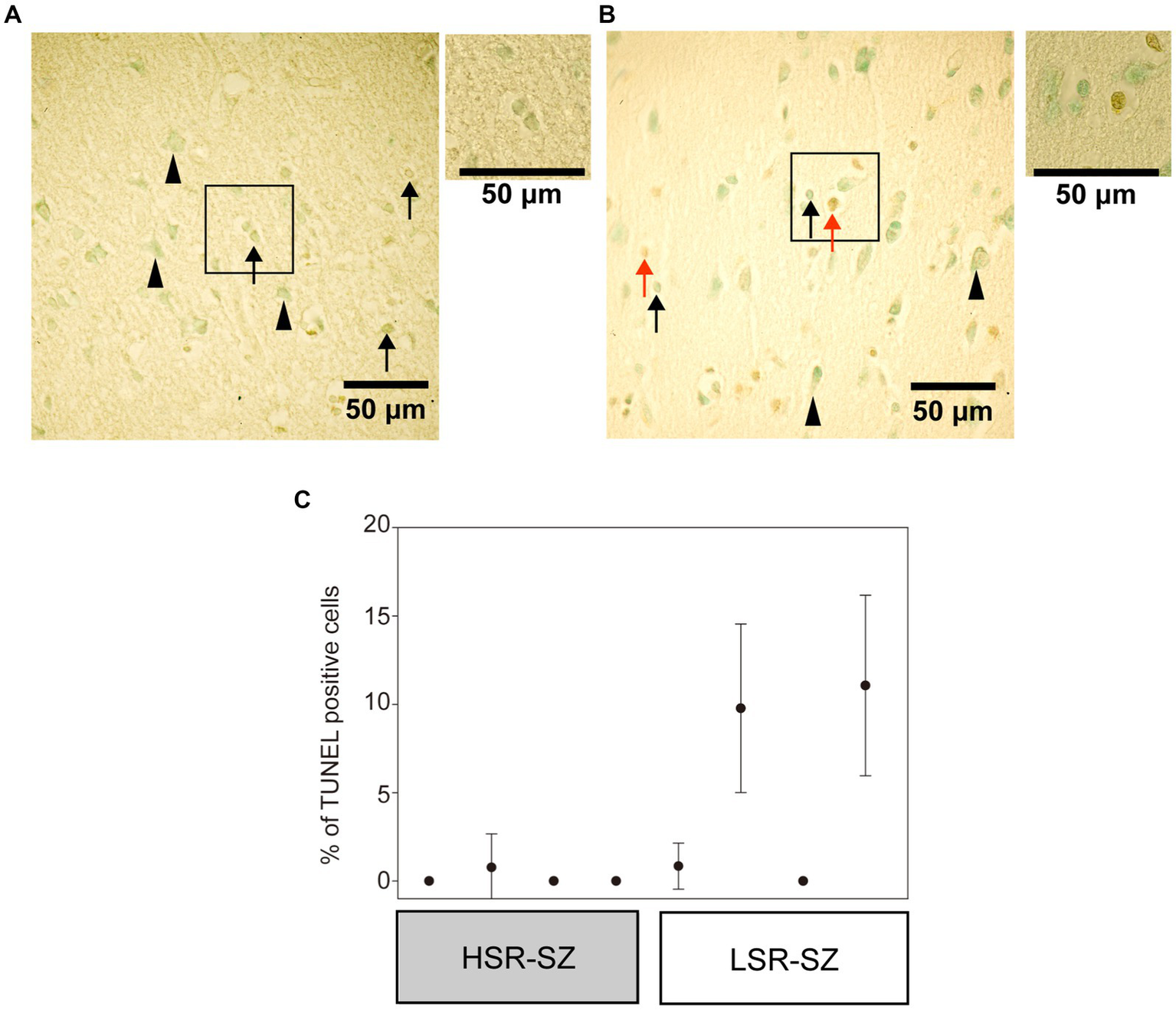 Formalin-fixed paraffin-embedded tissue sections (7 μm thick) from Brodmann area 10 of eight SZ patients (four patients of each high and low stress-response SZ group) (Table 3) were processed with proteinase K (20 μg/mL) (EMD Millipore, Temecula, CA, United States) directly on the slides (60 μL/ cm2) for 15 min at room temperature (25°C), followed by Terminal deoxynucleotidyl transferase-mediated dUTP nick end labeling (TUNEL) staining by Apop Tag Plus Peroxidase in situ apoptosis detection kit (EMD Millipore, Temecula, CA, United States) as manufacturer’s instruction. The specimens were stained with methyl green (Muto Pure Chemicals, Tokyo, Japan) and observed under a microscope (BX51, Olympus, Tokyo, Japan) with × 40 [numerical aperture (NA) = 0.75] and × 60 (NA = 1.42) objective lens. All images were captured under the same conditions using an RGB camera (α7S II, Sony, Tokyo, Japan). For the determination of the TUNEL positivity rate, six images were captured per case in the third cortical layer under a × 40 objective lens. We used an Imaging Edge Desktop (Sony) to process the images. ImageJ (42) was used to count TUNEL-positive and methyl green-positive cells. The TUNEL-positive area stained with diaminobenzidine and methyl green-positive area were extracted separately using the “Color Deconvolution” plugin, and each was binarized using the “Threshold” tool with the default settings. Then, TUNEL-positive and methyl green-positive cells were counted using the “Analyze particles” tool with a defined minimum size of 2000 pixel2 and circularity range of 0.1–1.