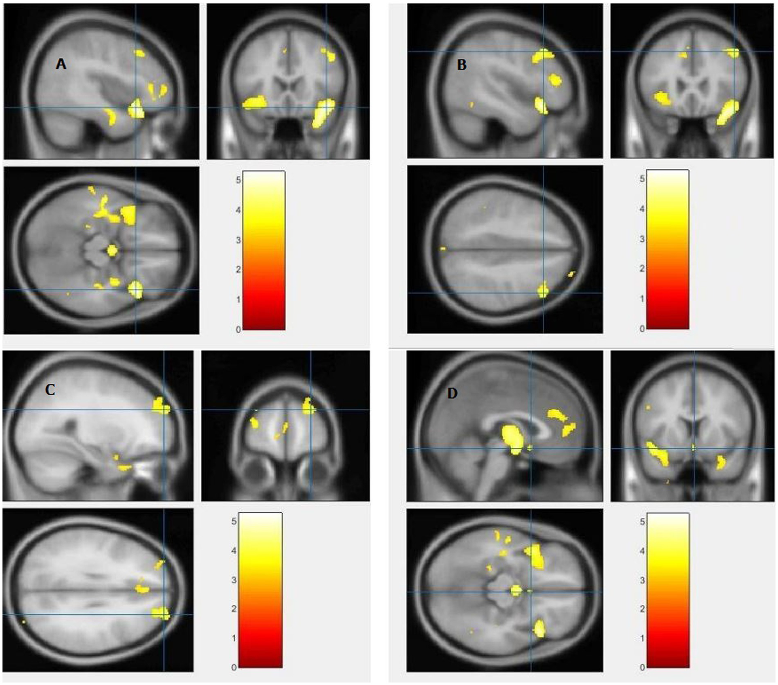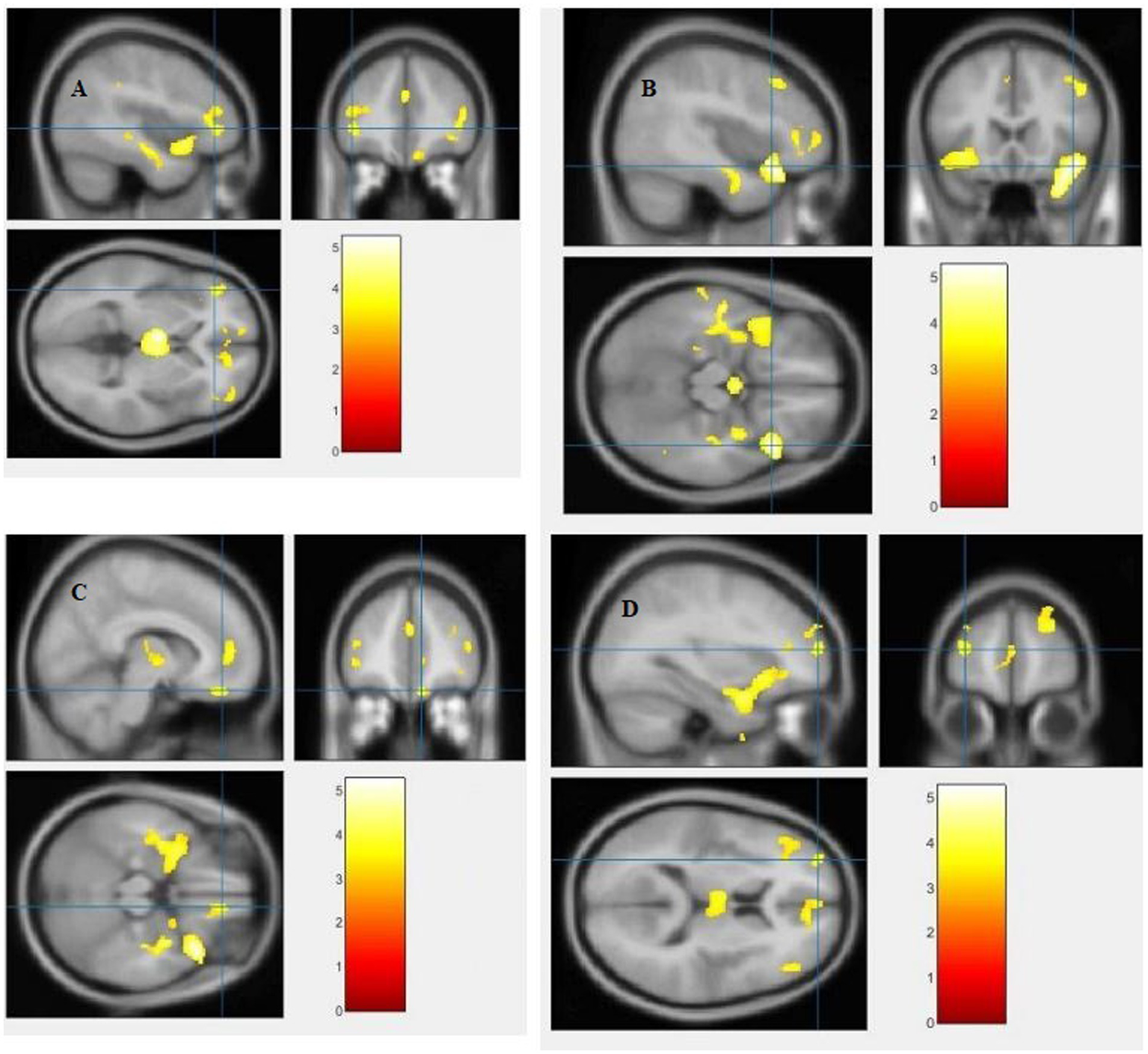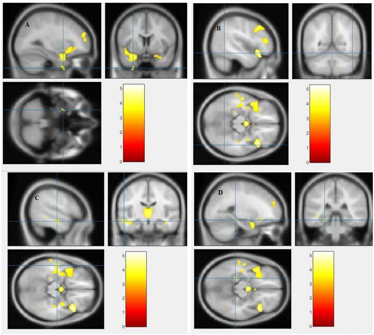 Voxel-based morphometric analyses identified gray matter (GM) alterations in the Right inferior frontal gyrus (A), Right middle frontal gyrus (B), Right superior frontal gyrus (C) and Right subcallosal gyrus (D), with statistical significance at p < 0.05 and an extent threshold of K = 100 when SZ < HC.