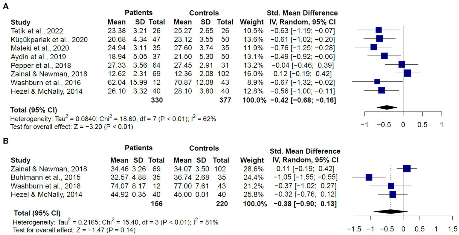 The meta-analysis including studies assessing ToM in patients diagnosed with GAD or SAD together (k = 10) showed significant differences between groups, with patients showing lower scores than healthy controls (SMD = −0.38, CI = −0.71 – 0.005, z = −2.280, p < 0.01) (Figure 4A). Significant and substantial heterogeneity was observed (Q = 46.12, df = 9, p < 0.001, I2 = 81%). It is worth noting that only two studies (6, 26) showed no significant differences between GAD or SAD patients and healthy controls in ToM abilities using the RMET. Seven studies (20, 22–25, 28, 49) reported significantly lower performance in patients, three of them used the RMET, three used the RMET and the MASC, and one, the RMET and the FPT. Only one study, using the FPT, found that SAD patients exhibited higher accuracy than the control group.