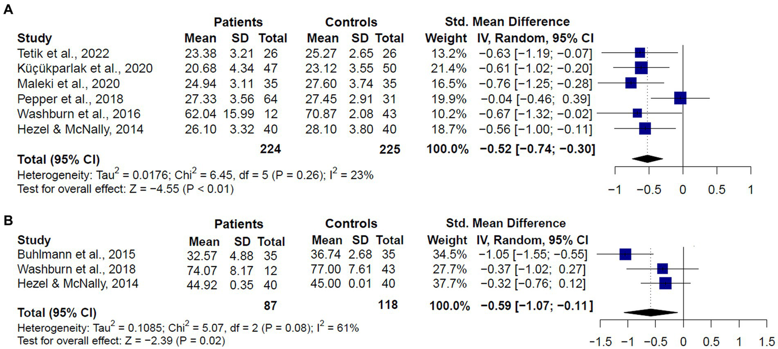 When we analyzed the performance of SAD patients compared to healthy controls (k = 6), we also found that patients performed significantly worse in the RMET (SMD = −0.52, CI = −0.74 – −0.30, z = −4.55, p < 0.01), and no significant evidence for heterogeneity was found (Q = 8.97, df = 5, p = 0.26, I2 = 23.2%) (Figure 6A). For the MASC (k = 3), we also found significantly worse performance in SAD patients than controls (SMD = −0.59, CI = −1.07 – −0.11, z = −2.39, p = 0.02). However, considerable heterogeneity was found (Q = 5.07, df = 2, p = 0.08, I2 = 61%) (Figure 6B).