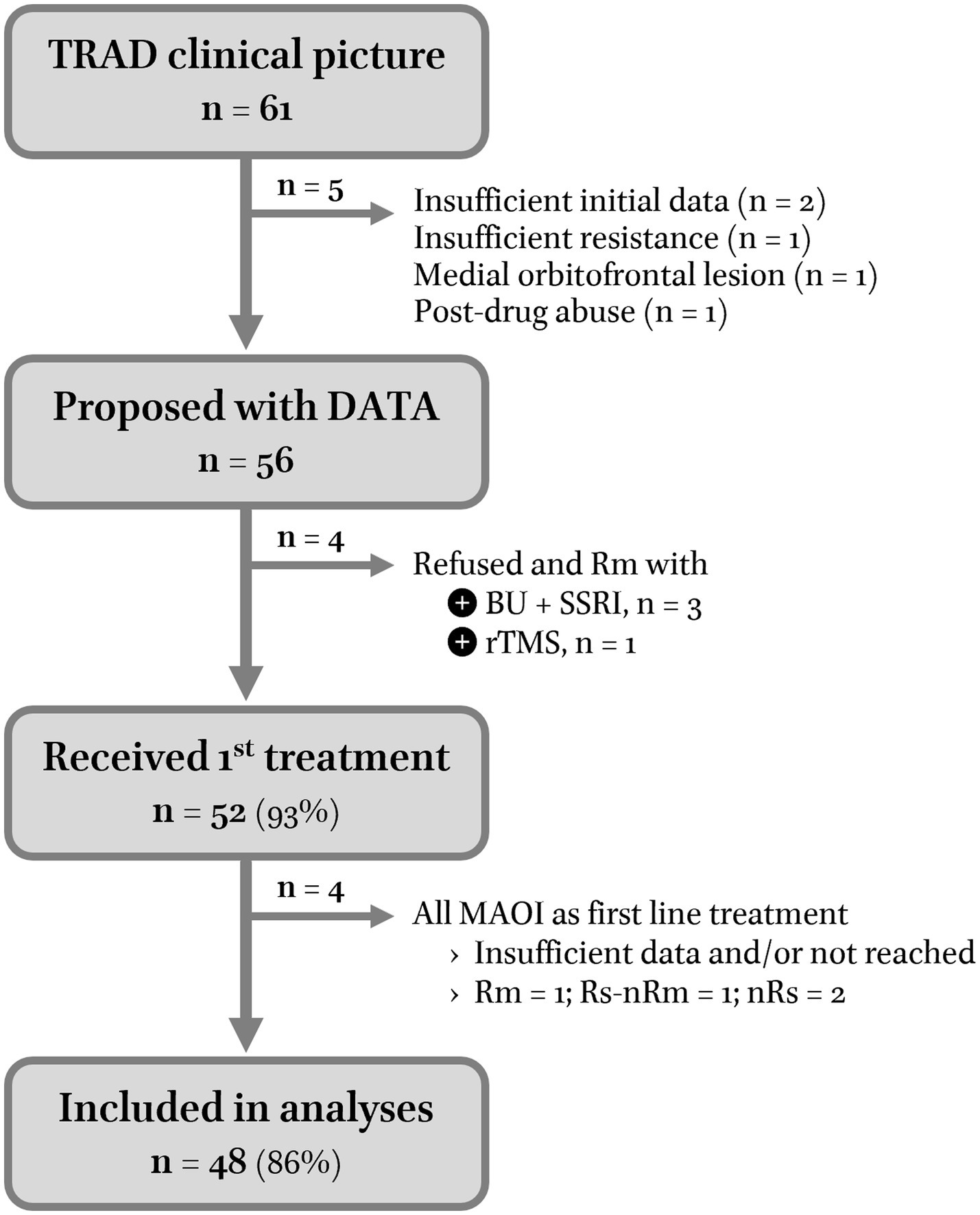 Flow chart of Chronic Anergic-anhedonic Depression Open Trial (CADOT). In total, 56 out of 61 TRAD outpatients presenting to Strasbourg’s TRD reference center between 2013 and mid-2021 were proposed to be treated along DATA guidelines (none had contraindications to dopaminergic treatment). Of the four patients who wanted to try another option and remitted (Rm), three benefited from the combination of bupropion to an SSRI which is already a dopaminergic strategy. Because bupropion is not covered by the French health insurance system, it was not considered in this analysis. Only a few patients who could afford it had a bupropion trial before entering DATA. It should be noted that no patients responded to mood stabilizers alone. However, antidepressant washout periods longer than 8 weeks (mood stabilizers alone) were systematically offered to bipolar patients only until 2017. The lack of success led us to be less insistent thereafter.