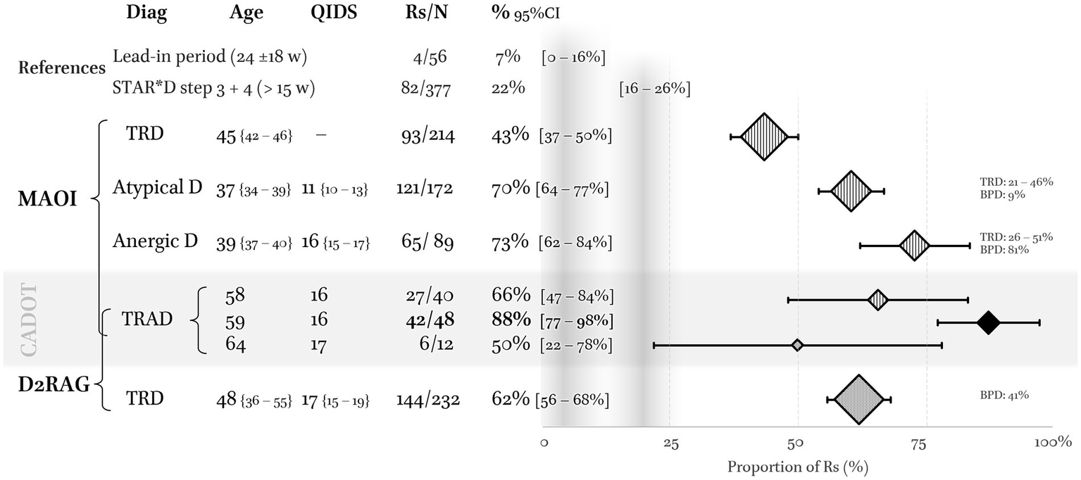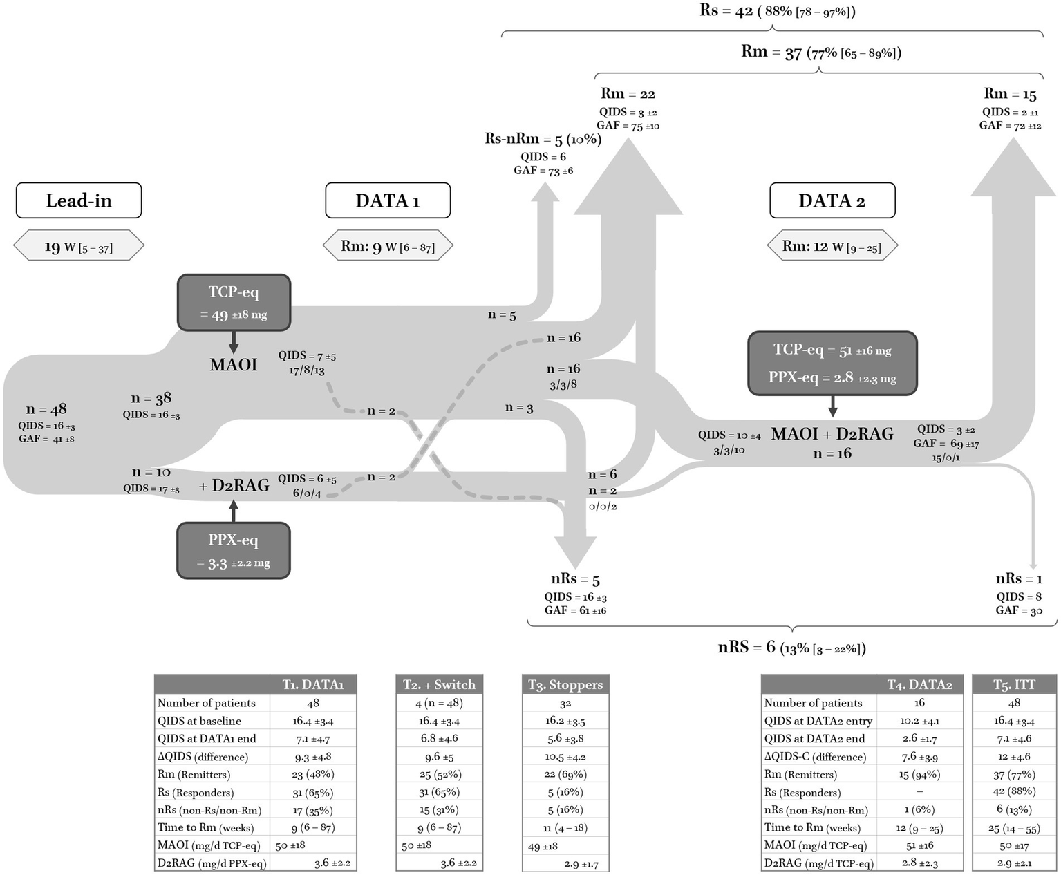 The flow chart of the study is reported in Figure 3. The long preparation/lead-in period of 19 [5–37] weeks corresponds to the time it took to get patient approval of the DATA as a treatment scheme (meanwhile other treatments could be tried), to introduce a mood stabilizer, and to stop incompatible treatments, i.e., D2RAG and other antidepressants if MAOI was accepted as the first step.