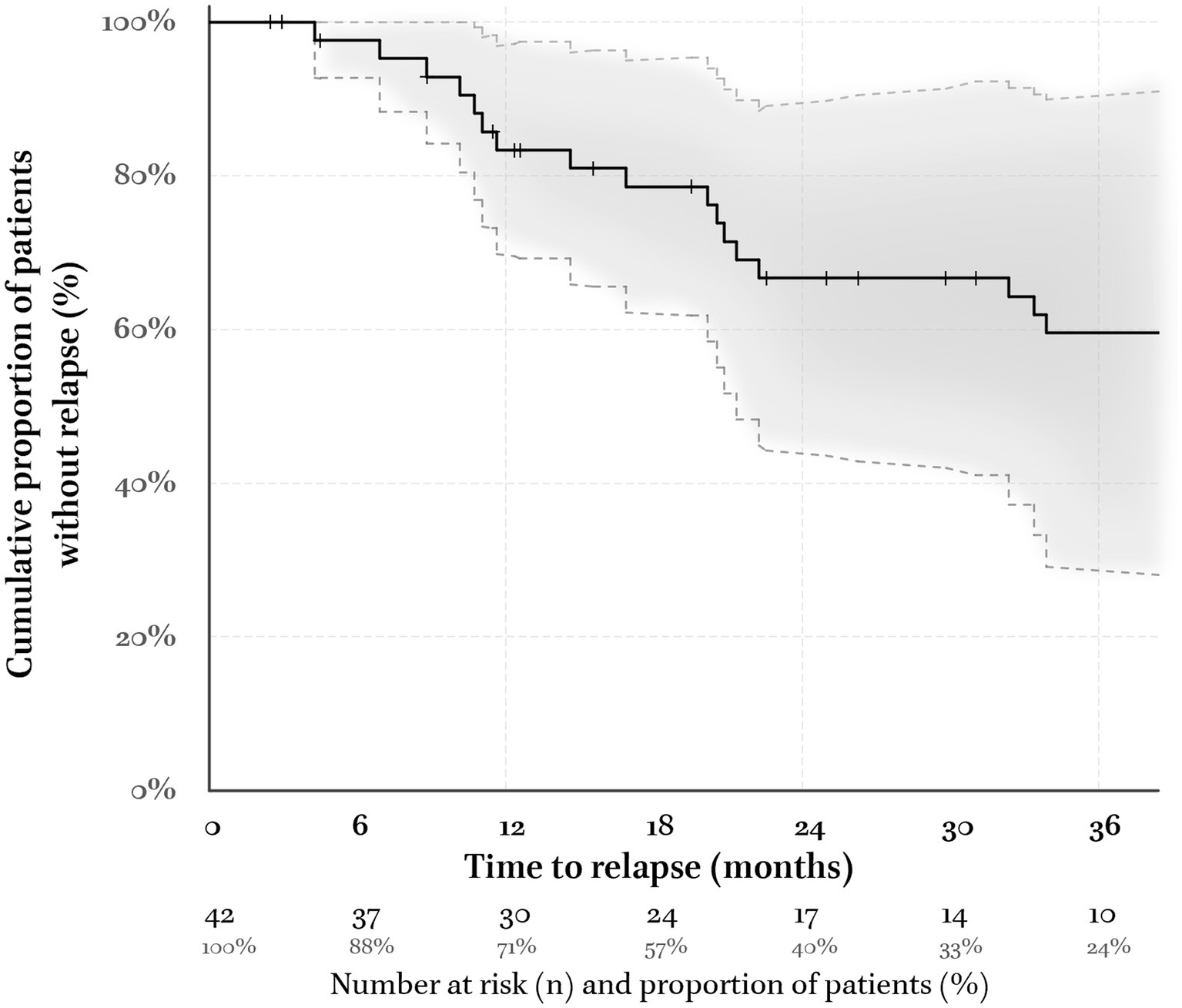Out of 52 outpatients with TRAD treated with DATA in a single expert center, 48 were included in the analysis [severity – QIDS (Quick Inventory of Depressive Symptomatology) = 16 ± 3; episode duration = 4.1 ± 2.7 years; Thase and Rush resistance stage = 2.9 ± 0.6; functioning – GAF (Global Assessment of Functioning) = 41 ± 8]. These were followed-up for a median (1st – 3rd quartile) of 4 (1–9) months before being prescribed the first dopaminergic treatment and remitters were followed up 21 (11–33) months after remission.