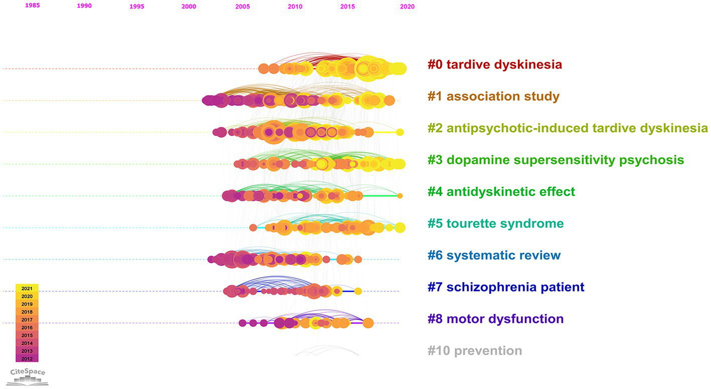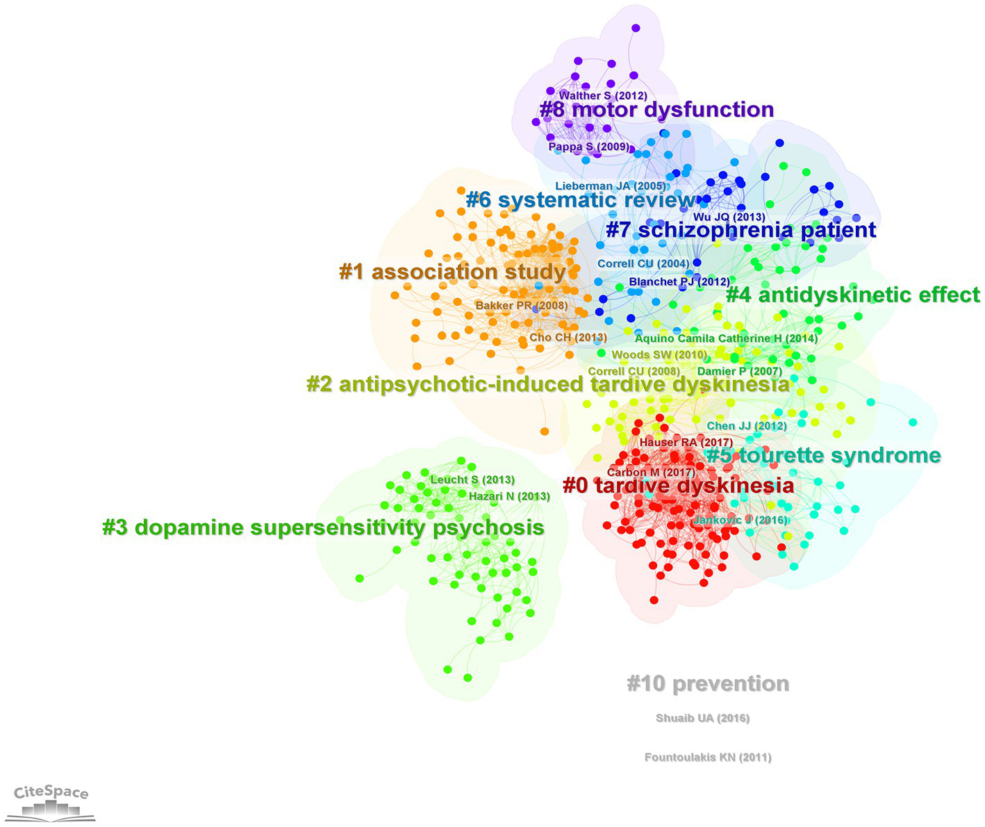Figure 3. Co-citation network showing major research themes in tardive dyskinesia between 1968 and 2021, visualized using CiteSpace. Co-citation is the frequency of two publications being cited together. Colors represent research themes/clusters. The spatial arrangement of clusters represents the structural and temporal relationship among them. In this network, older clusters appear on the left and newer clusters on the right.