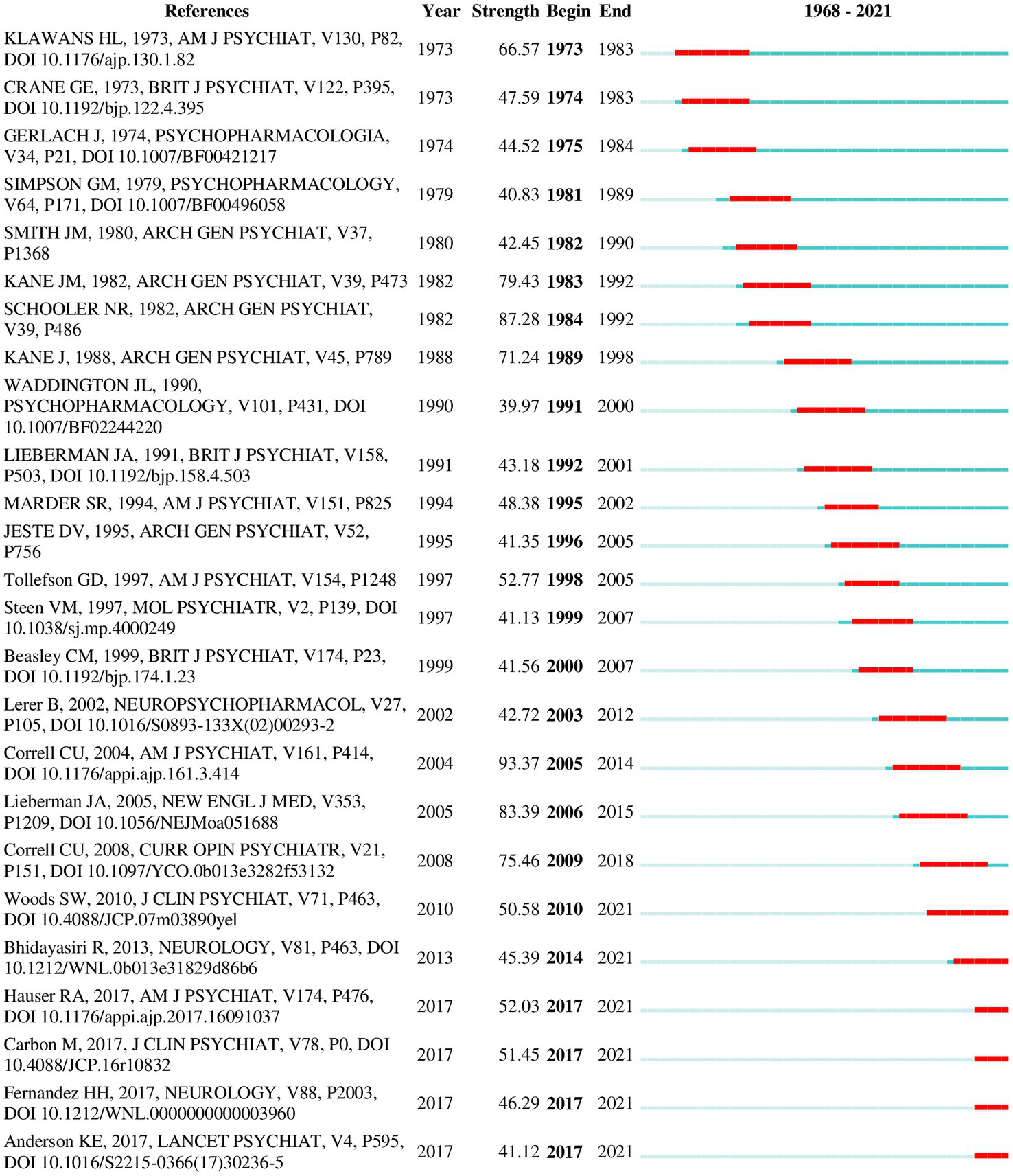 A relatively small cluster named “bipolar disorder” had become active during the 1990s (mean year = 1995, cluster size = 60). This cluster represents the increased attention directed toward the use of antipsychotics for the treatment of bipolar disorder and the consequent concerns for TD. The publication with the highest burst strength in this cluster was a placebo-controlled study that assessed the efficacy and safety of olanzapine for the treatment of acute mania (59). In this study, no significant difference in the risk of TD was found for olanzapine in comparison with a placebo.