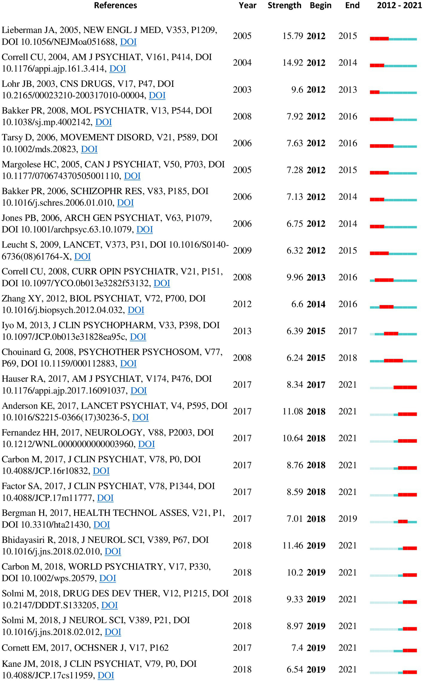 A cluster named “motor abnormalities” (cluster size = 49, mean year = 2011), which has been active during the last decade, examines the notion that primary motor abnormalities are part of a neurodysfunction intrinsic to the pathogenesis of schizophrenia. The most influential publication in this cluster (sigma = 12.8) was a systematic review on spontaneous movement disorders in antipsychotic-naive patients with first-episode psychoses (64). The most relevant citer of this cluster was a review (65) postulating motor dysfunction as an intermediate phenotype across schizophrenia and other psychotic disorders. The corresponding cluster from the 2012–2021 network was named as “motor dysfunction.”