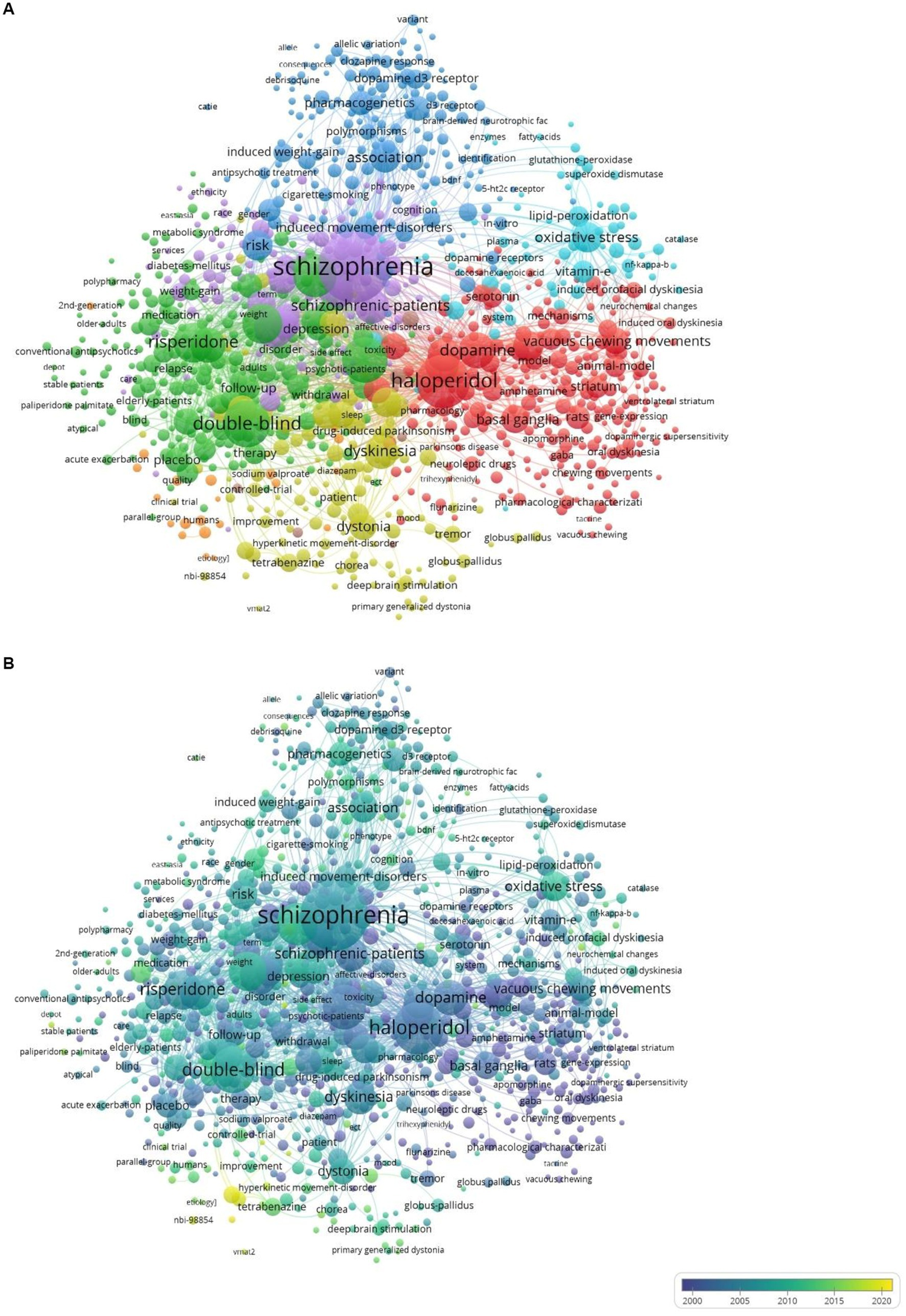 The overlay visualization of the keyword network (Figure 9B) illustrates temporal trends in keyword occurrence. The most recent keywords (shown in yellow or yellow-green) were VMAT 2 inhibitor (mean year = 2019.5), deutetrabenazine (mean year = 2019.1), valbenazine (mean year = 2018.7), nbi-98,854 (mean year = 2018.5), dopamine supersensitivity psychosis (mean year = 2017.6), and tardive syndrome (mean year = 2017.56).