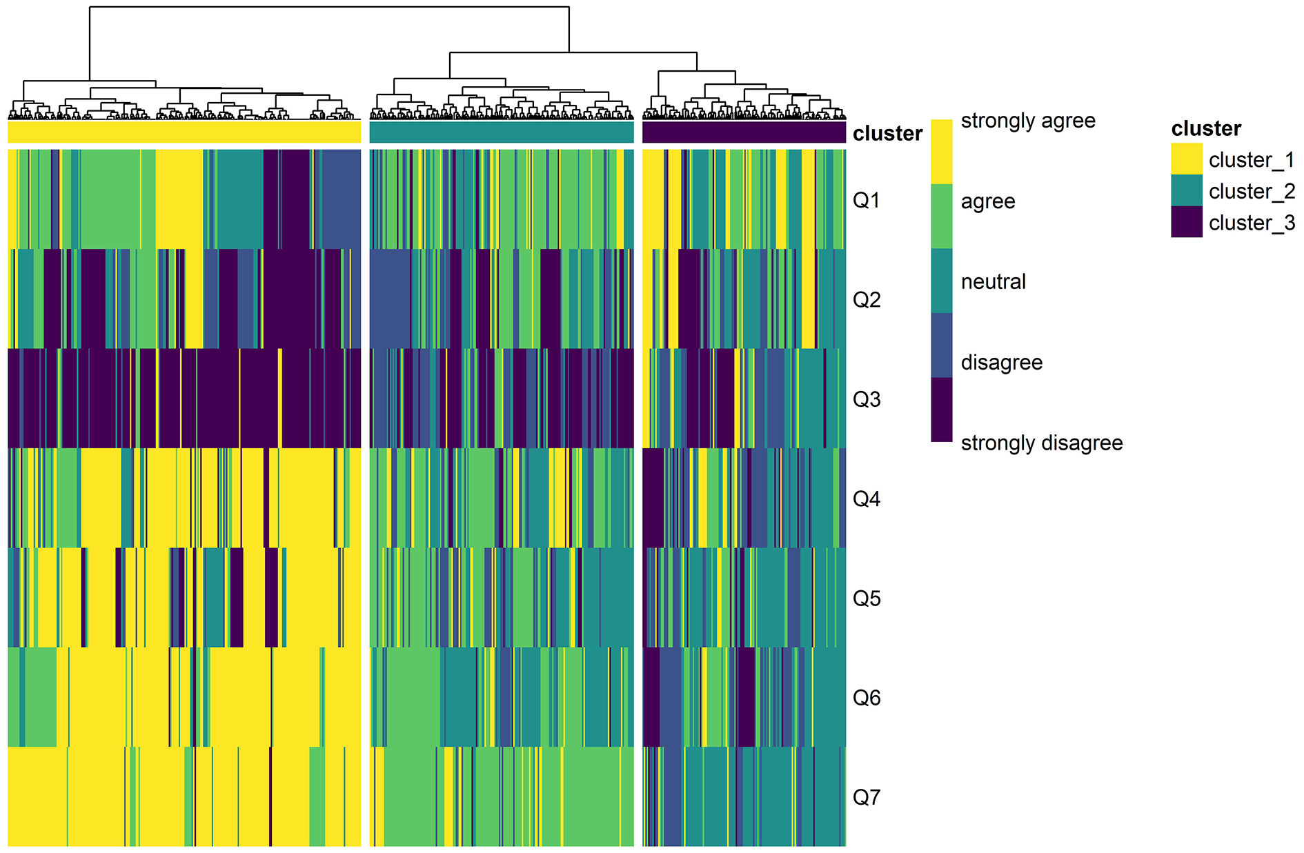 Heatmap and dendrogram of the hierarchical clustering analysis results; clusters 1–3 were distinguished based on the responses to the seven questions on attitudes toward COVID-19 vaccination of individuals with mental disorders.