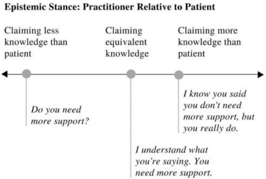 Sociologists distinguish between epistemic status and epistemic stance (16). Epistemic status involves expectations of knowledge, based on roles, e.g., doctor/patient, teacher/student, and experiences such as having studied a topic or having witnessed an event (Figure 1). For example, a teacher would typically be expected to know more about the topic of a lesson relative to a student. Similarly, a doctor would be expected to know more about diagnosis than a patient. This would mean that the teacher/doctor had a higher epistemic status than the student/patient on that topic. While a doctor would have higher epistemic status than a patient with respect to diagnosis, a patient would have higher epistemic status than a doctor on their experiences and emotions.