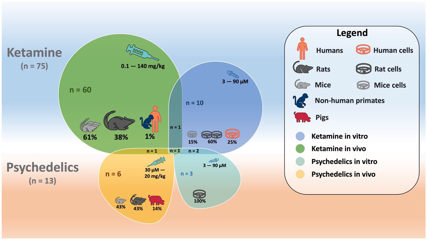 Figure 2. Schematic overlapping shapes illustrating features (i.e., number of studies, cells studied, species, doses, etc.) for in vitro and in vivo studies investigating ketamine and psychedelics.