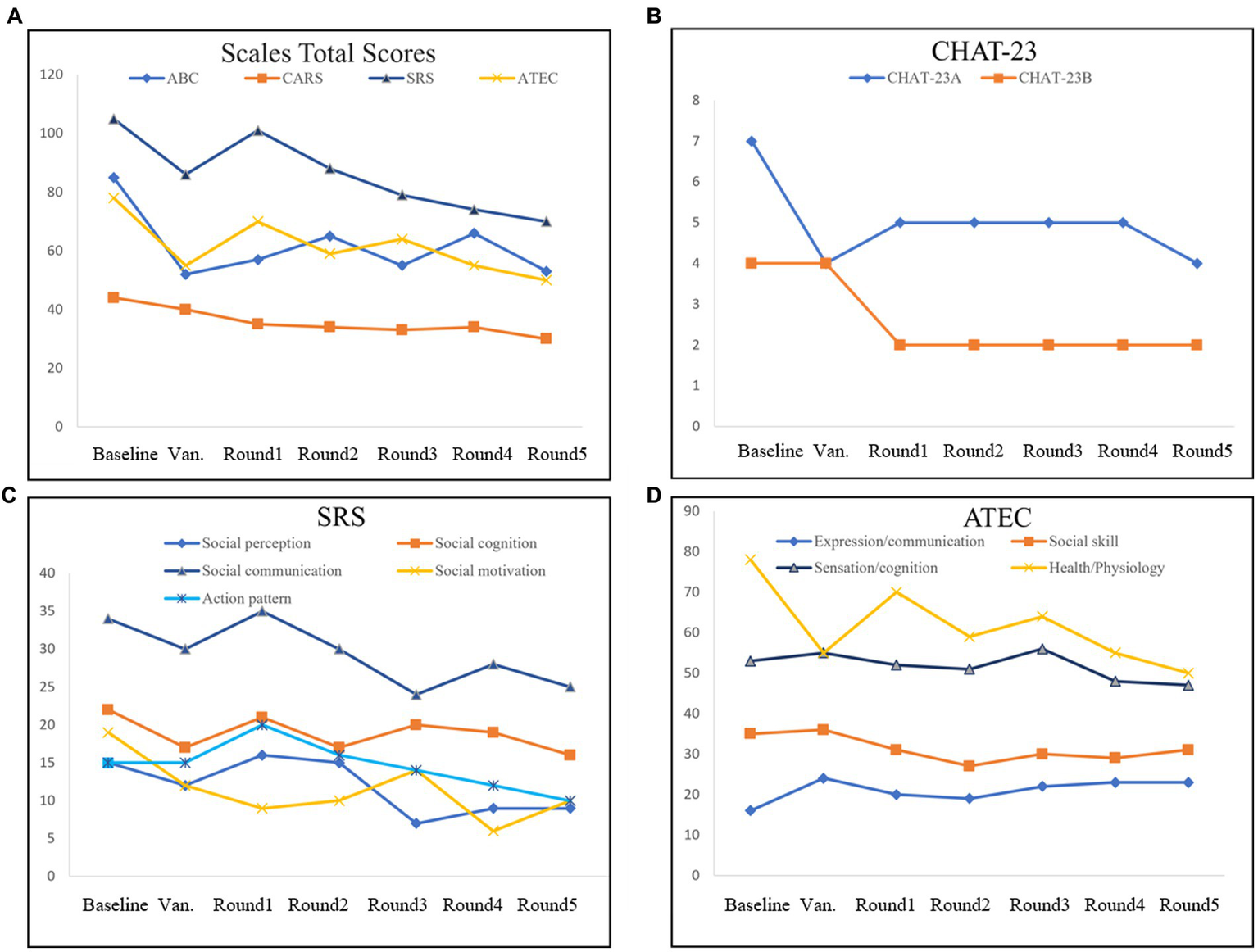 Evaluation of the scales in FMT. The Scales Total Scores (A), including Autism Behavior Scale (ABC), Autism Assessment Scale (CARS), Social Response Scale (SRS), and Autism treatment evaluation checklist (ATEC). Positive items in Checklist for Autism in Toddlers-23 (CHAT-23; B). Evaluation checklist details in SRS (C). Evaluation checklist details in ATEC (D).