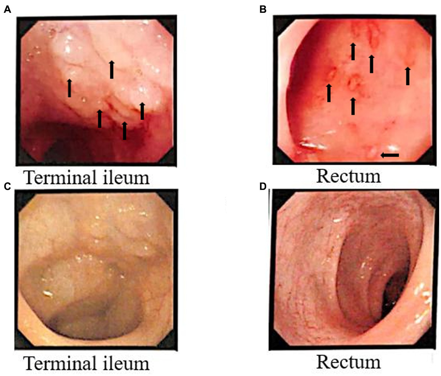 Colonoscopy results before and after FMT. Before FMT, the arrows indicate multiple granulomatous changes in the Terminal ileum (A), and in the rectum (B) the arrows indicate bleeding sites accompanied by inflammatory changes. Terminal ileum (C) and rectal (D) surface results after FMT.