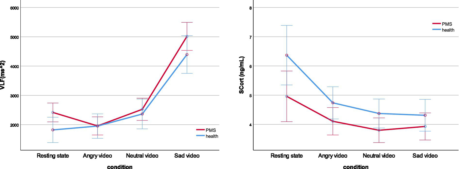 To be specific, in PMS group, DBP significantly raised during sad video, SCL raised during both angry and sad video, and HF raised during neutral video. In both groups, SDNN, RMSSD and LF/HF dropped dramatically during sad video, VLF surged during sad video, and NN50 raised during angry video and dropped continuously during neutral and sad videos. LF raised during neutral video and declined during sad video in both groups and declined during angry video in PMS group. TP surged during sad video in both groups and declined during angry video in PMS group. SCort declined after neutral video in PMS group and declined continuously in all three video conditions in healthy group.