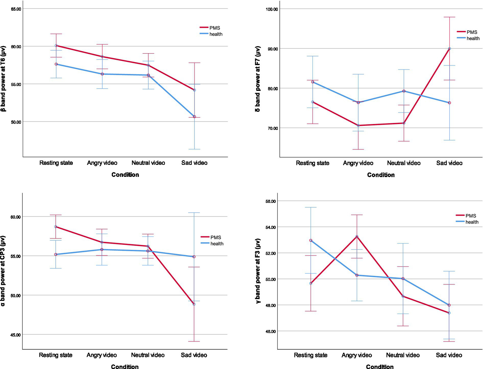 Simple effect analysis showed that the δ band power at F7 and F8 of PMS group was lower than that of healthy group during neutral video (Fdelta F7 (1,51) = 5.261, p = 0.026, η2 = 0.094; Fdelta F8(1,51) = 4.076, p = 0.049, η2 = 0.074), but higher than that of healthy group during sad video (Fdelta F7 (1,51) = 4.968, p = 0.030, η2 = 0.089; Fdelta F8(1,51) = 5.112, p = 0.028, η2 = 0.091). The α band power at CP3, CP4, P3 and P4 of PMS group was higher than that of healthy group at rest (Falpha CP3 (1,51) = 6.119, p = 0.017, η2 = 0.107; Falpha CP4(1,51) = 4.347, p = 0.042, η2 = 0.079; Falpha P3 (1,51) = 9.288, p = 0.004, η2 = 0.154; Falpha P4(1,51) = 5.399, p = 0.024, η2 = 0.096). The γ band power at F3, FZ, and FC3 of PMS group was higher than that of healthy group during angry video (Fgamma F3 (1,51) = 5.338, p = 0.025, η2 = 0.095; Fgamma FZ(1,51) = 5.022, p = 0.029, η2 = 0.090; Fgamma FC3 (1,51) = 5.016, p = 0.029, η2 = 0.090). The main results are shown in Table 3, and outcomes of β band power at T6, δ band power at F7, α band power at CP3 and γ band power at F3 are shown in Figure 2.