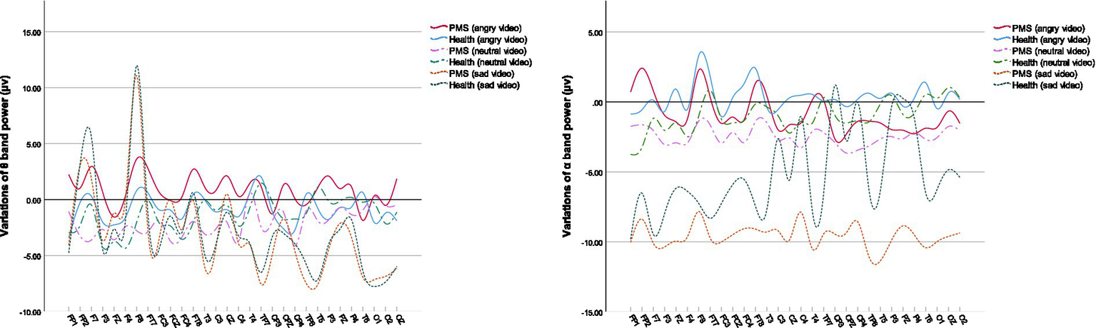 The experiment data were analyzed using a 2 group (PMS, healthy group) × 4 condition (resting, angry, neutral, sad) repeated-measures ANOVA, and corrected according to Greenhouse–Geisser correction. The analysis mainly focused on the differences between groups. In correlation analysis, we relied on the Spearman correlation (0.1 < | r | < 0.3 as weak correlation, 0.3 < | r | < 0.5 as moderate correlation, | r | >0.5 as strong correlation). The threshold level for significance was p < 0.05. All statistical analyses were carried out in SPSS 26.0.
