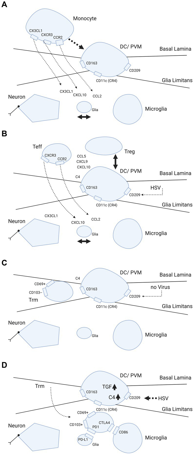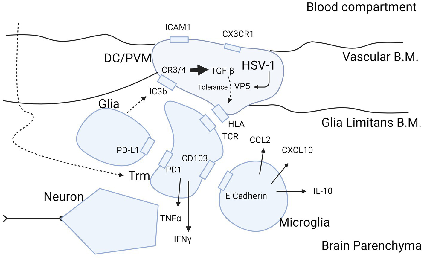 Trafficking of myeloid cells and T-cells into brain parenchyma and hypothetical dependence retainment of T-cells on immune modulation by HSV. (A–D) Cascade of events illustrating what happens when brain parenchyma becomes involved in intracellular viral infection. The consecutive steps are: (A) release of chemokines and attraction of monocytes from the blood by interaction between neurons, glia and microglia; (B,C) strategic positioning of monocytes differentiated into DC/PVM in the BBB; and (D) eventual transmigration of T-cells into brain parenchyma dependent on HSV. In further detail, (A) primary response after parenchymal infection, production of CCL2, CXCL1, CXCL10 chemokines that attract monocytes from the blood compartment with binding to their counter-receptors (CCR2, CXCR1 and CXCL10, respectively) on the monocyte cell surface. (B) Positioning of the monocyte as differentiated DC/PVM into space between basal lamina (endothelial basement membrane) and glia limitans (parenchymal basement membrane). With positioning within the BBB, this cell expresses CD11c (CR4, complement receptor 4), CD163 and CD209. Again, chemokines released from brain parenchyma play a part in the positioning. (C) Retainment of T-cells in the BBB space. Without further parenchymal triggers and inflammatory processes going on in the brain parenchyma, these cells develop into Trm (responsive, high expressing grB) with a CD69+ CD103- phenotype (58). (D) Shows what may happen if HSV infects the DC/PVM and changes the milieu within the BBB. In this scenario, HSV-1 promotes production of tolerizing complement C4 and TGF-β, which may lead to transmigration of T-cells within the BBB into the brain parenchyma and differentiation into (unresponsive, low grB expressing) Trm-cells with a CD69+ CD103+ phenotype. This phenotype is preferentially retained in the parenchyma by binding to complementary receptors of glia and microglia. Trm-cells express PD1 and bind to PD-L1 on glia and Trm express CTLA4 that binds to CD86 on microglia. Figure created with biorender.com.
