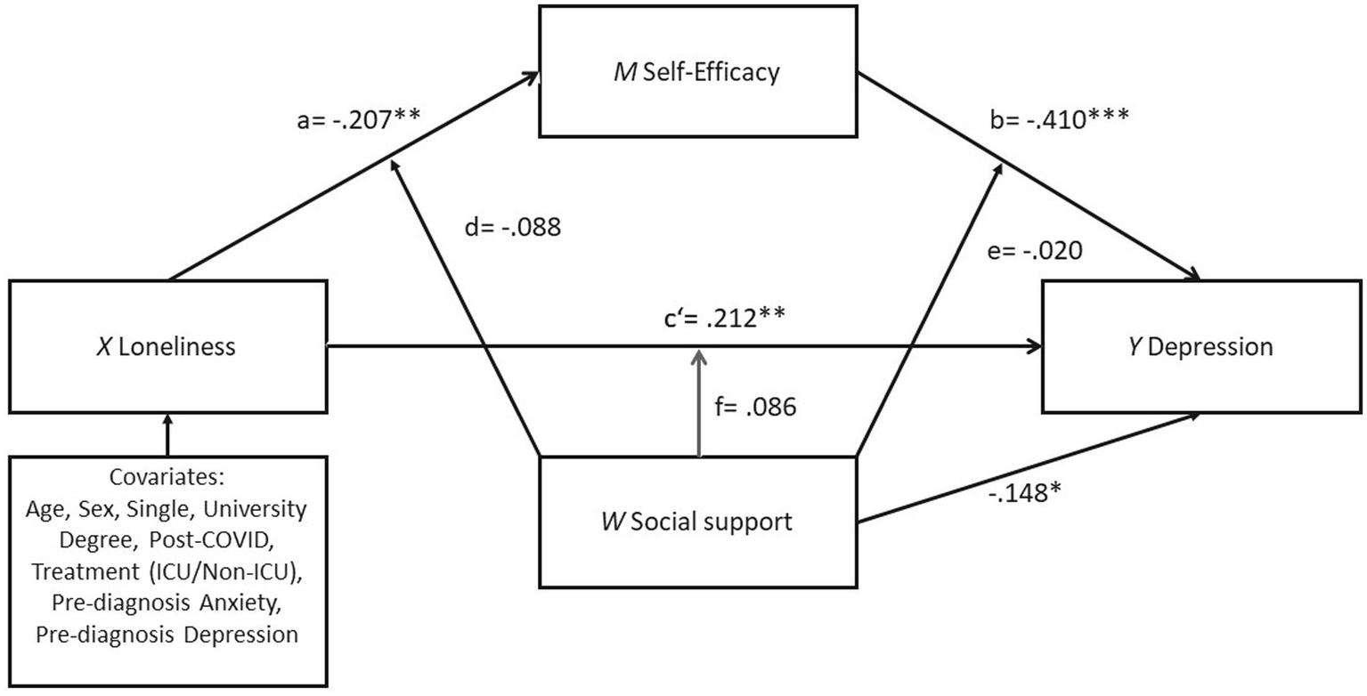 In contrast, low self-efficacy is associated with loneliness and depression (23). Self-efficacy and loneliness are critical indicators for developing depressive symptoms (21, 23). Self-efficacy is commonly associated with loneliness (24–26). Sierakowska and Doroszkiewicz (27) also recently reported significant associations between loneliness and generalized self-efficacy in the general population during the COVID-19 pandemic. Therefore, the constructs loneliness, self-efficacy beliefs, and social support are included as variables in this study.