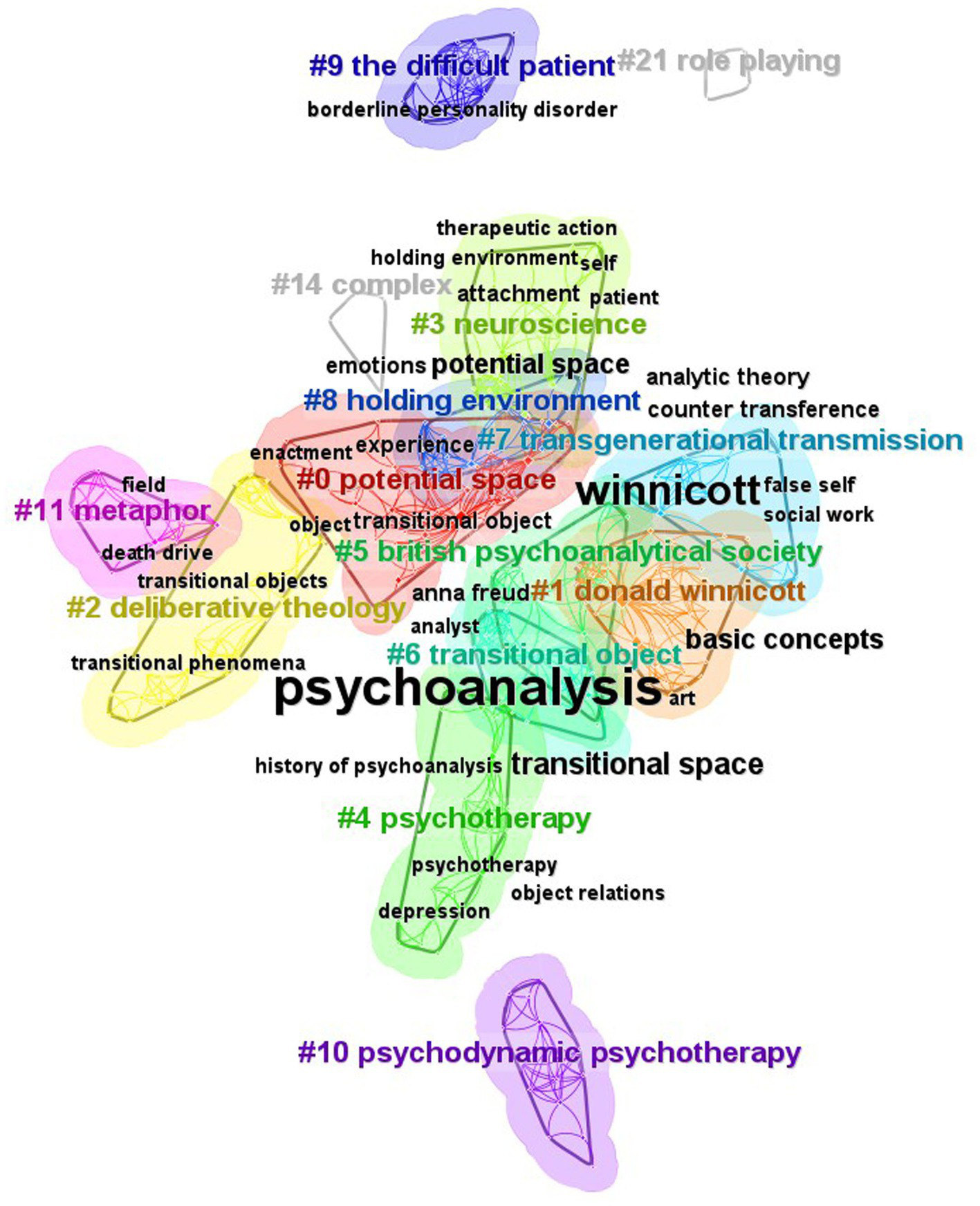 To figure out the research status and hotspots of Winnicott’s psychological treatment views in international research circles, we use CiteSpace software to conduct a clustering analysis based on the database of WoS Core Collection. We intend to present a macroscopic and panoramic study of Winnicott’s related theories, by summarizing the contents of the selected literature and exploring the hot topics, evolution characteristics, and future development trends of research on Winnicott with multiple dimensions such as figure and table.