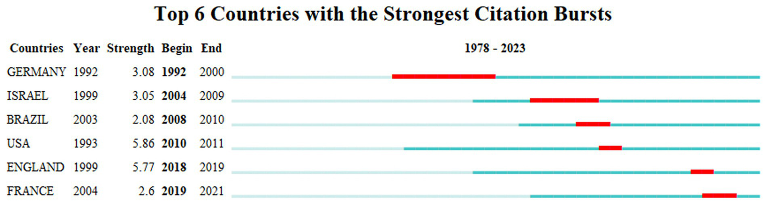 Top 6 Countries with the Strongest Citation Bursts.